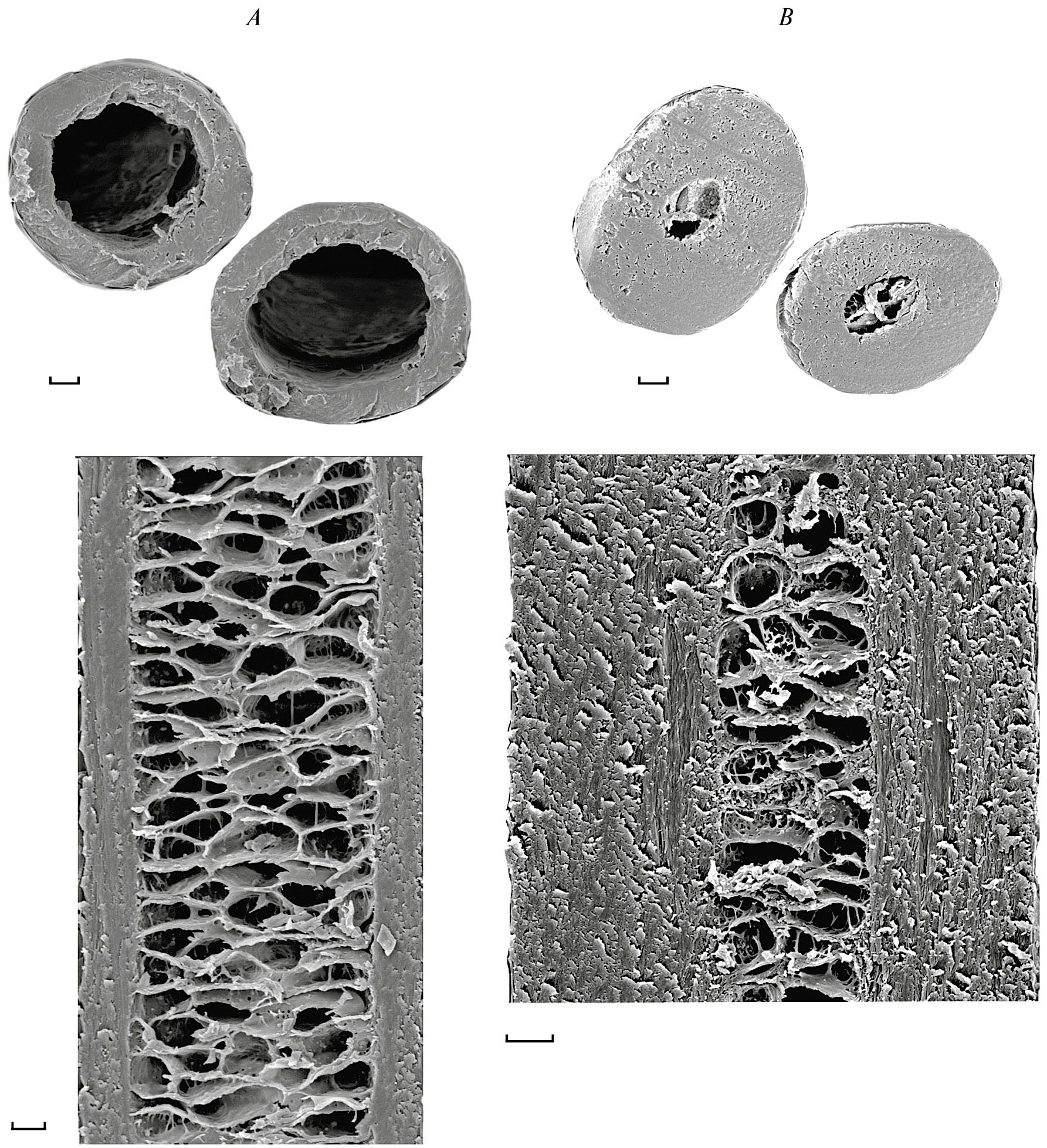 Рис. 2. Микроструктура остевых волос холки ленской лошади: А – Максунуохская мумия, В – Дюкарская мумия. Сверху вниз – поперечные сечения, продольные сечения стержня. Данные СЭМ. Масштаб 10 мкм.