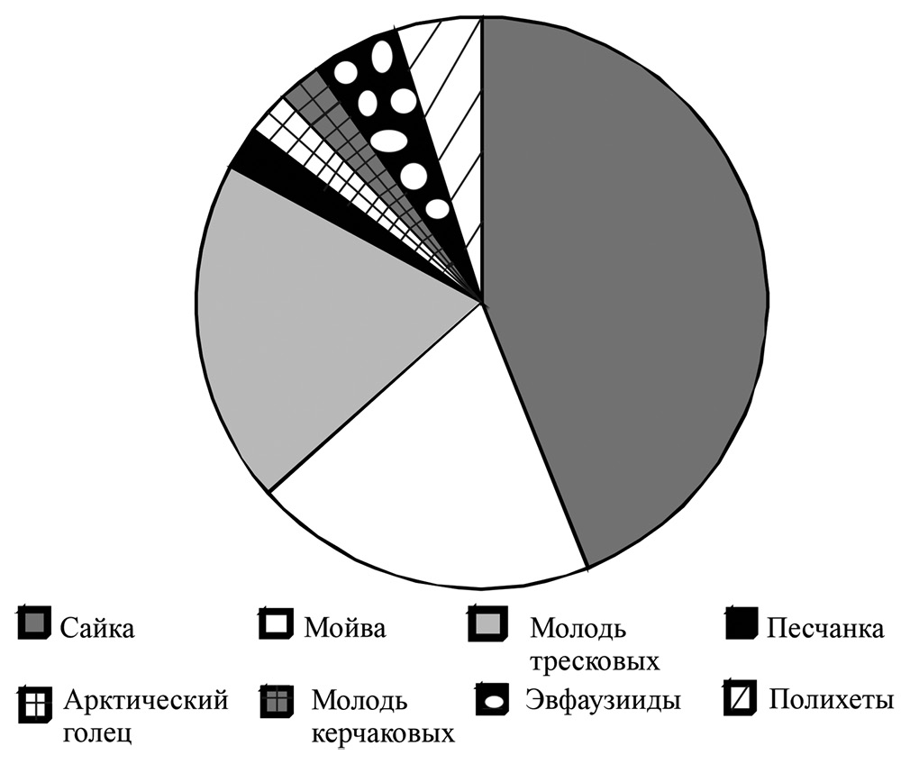 Согласно результатам изучения питания птиц, у 9 из 10 обследованных люриков желудки оказались пустыми, у одной особи обнаружены остатки планктонных ракообразных. Отсутствие содержимого в желудках также было отмечено у 4 гагарок, 4 тупиков, 7 чистиков, 18 тонкоклювых кайр и 28 толстоклювых кайр. Данные по относительной встречаемости кормов у птиц на южном прибрежье Баренцева моря представлены на рис. 1, а у толстоклювых кайр на высокоширотных архипелагах – на рис. 2. На южном прибрежье Баренцева моря в рационе всех птиц доминируют рыбные корма (прежде всего песчанка, мойва и молодь тресковых рыб), а беспозвоночные обнаружены лишь у тупиков и атлантических чистиков. В арктической зоне основу питания толстоклювых кайр составляют сайка, мойва и молодь тресковых рыб.
