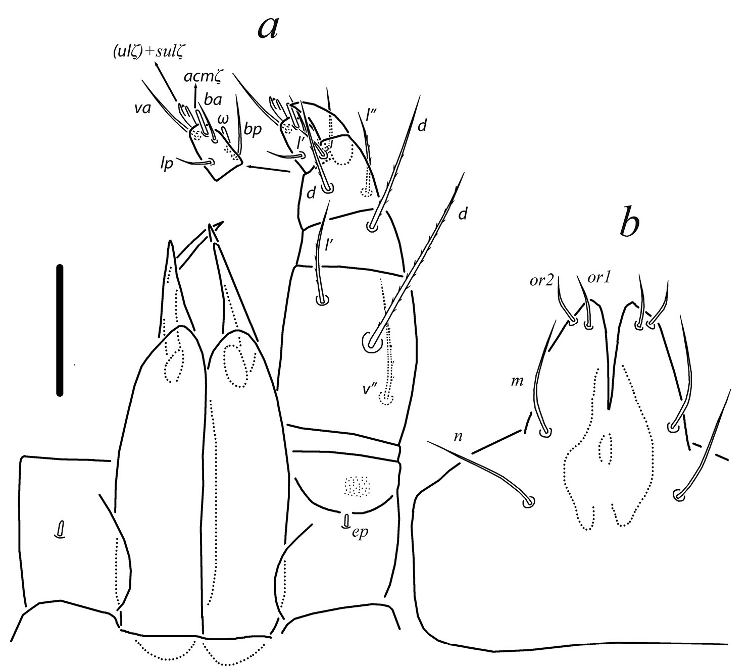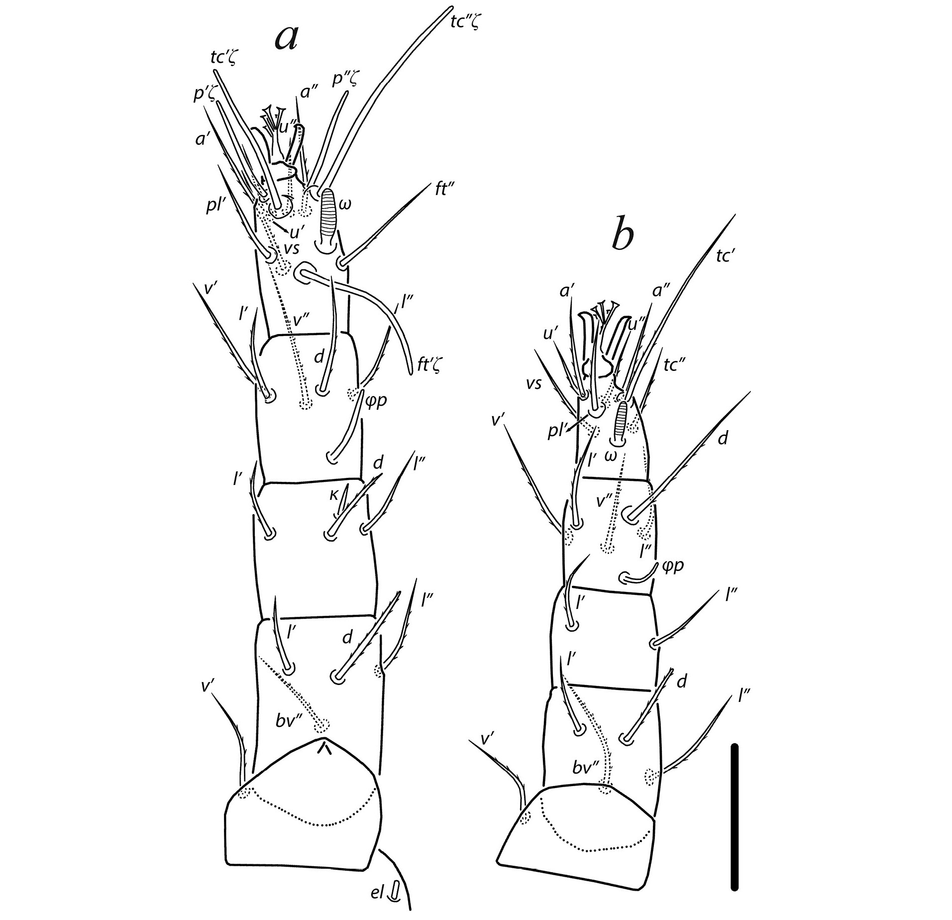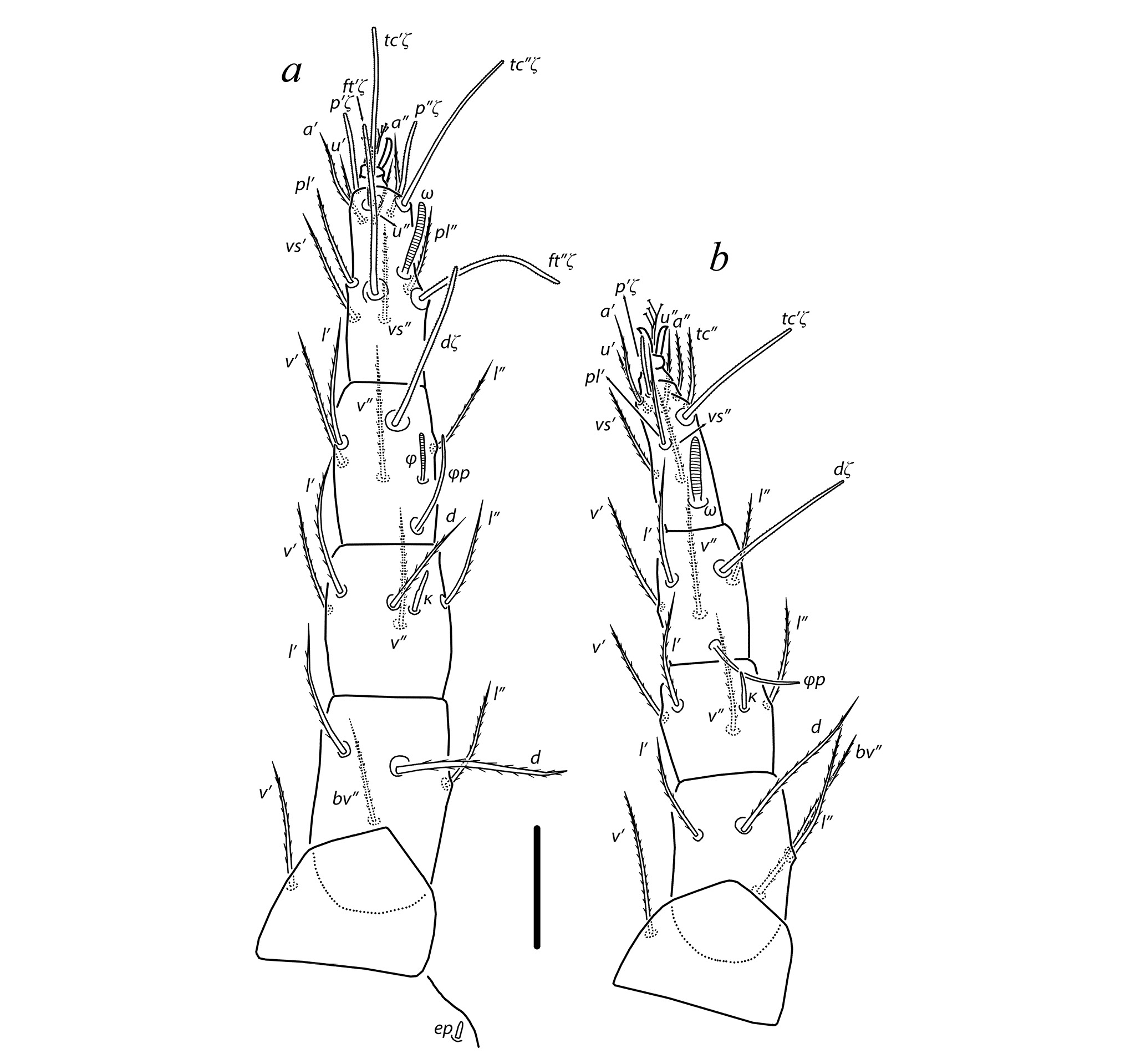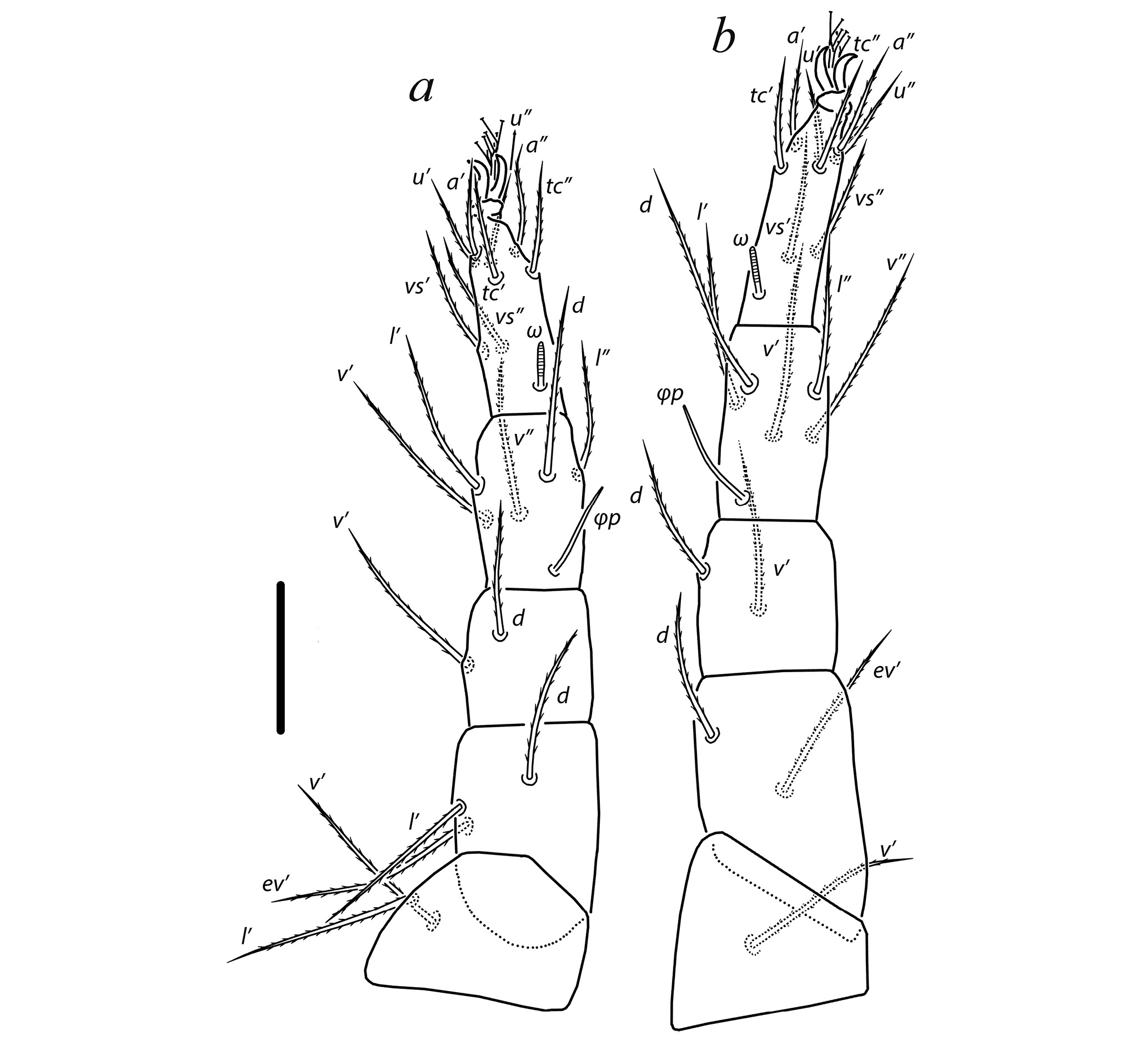 Seta k 7 of genu rod-like, slightly asymmetric; other setae (except eupathidia) pointed and weakly barbed. Solenidion ω 10 digitiform; solenidion φp 17 uniformly thin. Leg III (Fig. 3a). Leg setation: Tr 2 (l′, v′), Fe 3 (d, l′, ev′), Ge 2 (d, v′), Ti 5 (1) (d, l′, l″, v′, v″, φp), Ta 8 (1) (tc′, tc″, u′, u″, a′, a″, vs′, vs″, ω). Solenidion ω 7 baculiform; solenidion φp 15 uniformly thin. All leg setae pointed and barbed. Leg IV (Fig. 3b). Leg setation: Tr 1 (v′), Fe 2 (d, ev′), Ge 2 (d, v′), Ti 5 (1) (d, l′, l″, v′, v″, φ), Ta 8 (1) (tc′, tc″, u′, u″, a′, a″, vs′, vs″, ω). Solenidion ω 6 baculiform; solenidion φp 15 uniformly thin. All setae pointed and barbed.