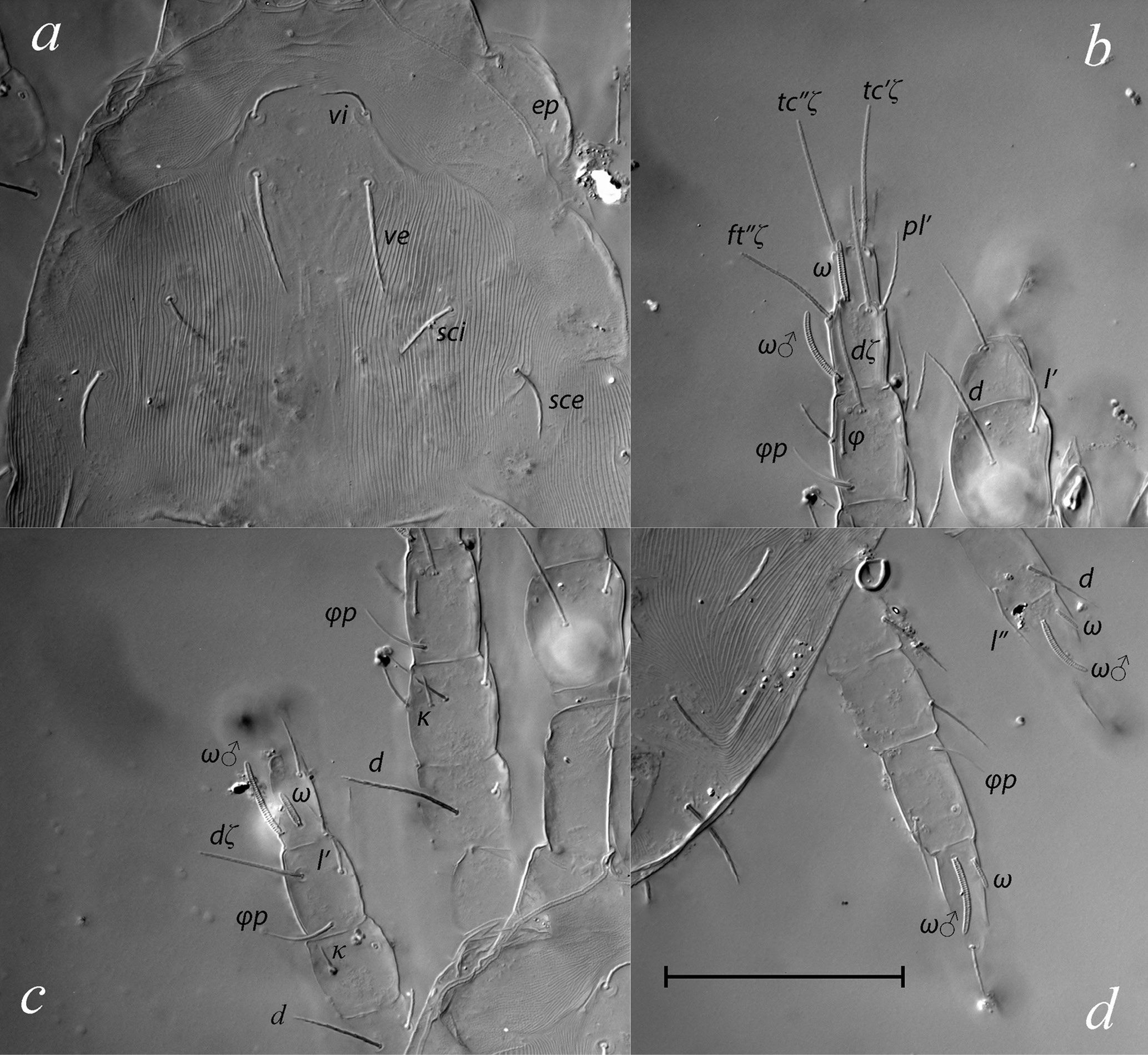 Fig. 6. DIC micrographs of Storchia cuneata Fan et Chen 1997, male: a – prodorsum, b – left leg I, c – left legs I and II, d – right legs III and IV. Scale bar 50 µm.