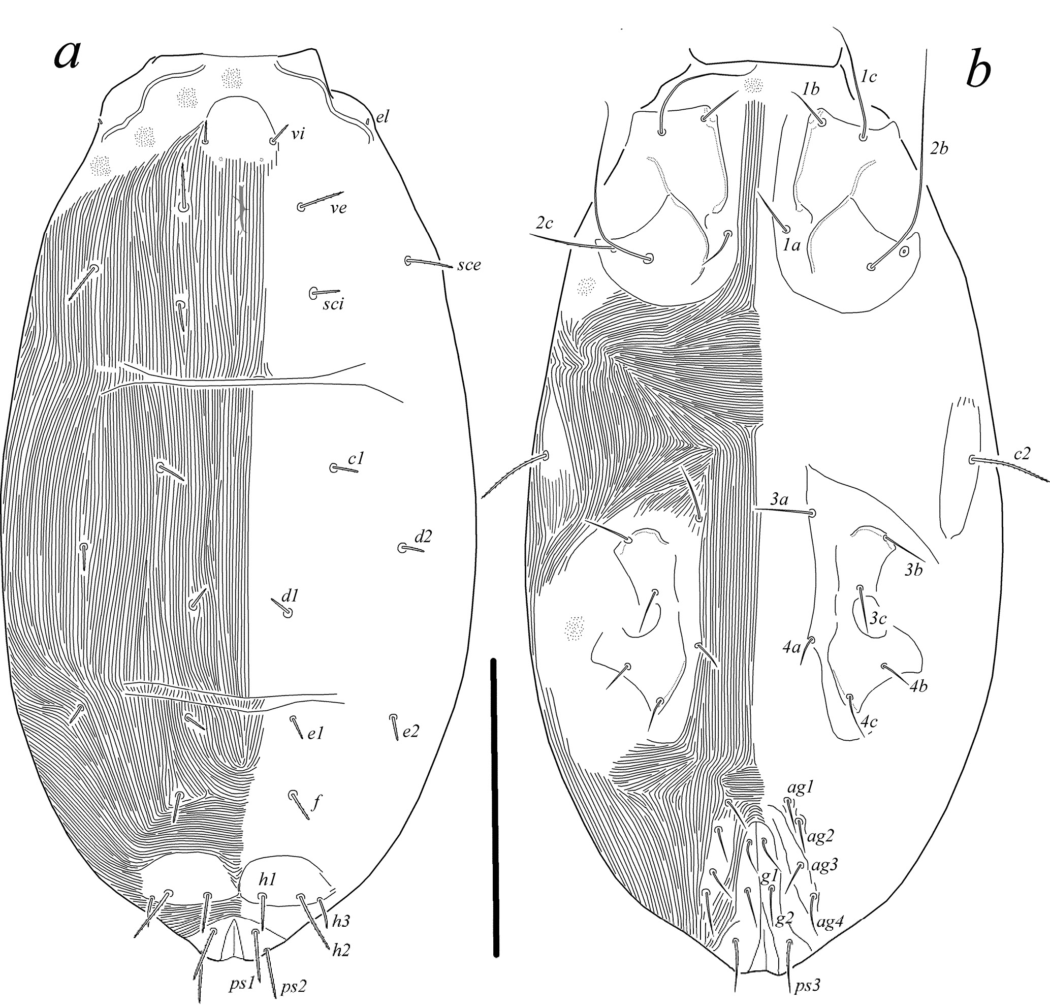 Idiosomal venter (Fig. 1b). All ventral plates smooth; four pairs of aggenital setae, setae ag3 and ag4 located on small plates; two pairs of genital setae. All ventral setae weakly barbed, setae ps1–ps3 and ag4 weakly blunt-tipped, other ventral setae pointed. Setae 3a located on small endopodal plates; setae 4a situated on striated cuticle. Cuticle just posteriad gnathosoma and laterad bases of legs I-II and III-IV with tubercles. Lengths of ventral setae: 1a 21, 1b 22, 1c 27, 2b 32, 2c 29, 3a 33, 3b 22, 3c 17, 4a 17, 4b 15, 4c 14, ag1 21, ag2 21, ag3 42, ag4 20, g1 17, g2 17, ps1 16, ps2 16, ps3 15.