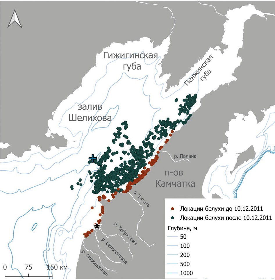 Все три белухи на протяжении безлёдного осеннего периода (август–сентябрь) оставались в акватории у западного побережья Камчатки, включая залив Шелихова. Льдообразование здесь началось в 2010 г. в середине ноября, в 2011 г. – в первых числах ноября. Самцы до начала льдообразования регистрировались в прибрежной акватории, перемещаясь между устьями крупных рек на незначительном удалении от места мечения. Самка провела в заливе Шелихова только сентябрь, а к октябрю переместилась севернее, в Пенжинскую губу. При продвижении белух на север самка, в отличие от самцов, обходила мыс Южный на значительном удалении от берега. Самец № 110720, помеченный в сентябре 2011 г., переместился в акваторию Пенжинской губы только после того, как припайный лед начал образовываться вдоль западного побережья Камчатки. По мере заполнения льдом залива Шелихова самец отходил дальше от берега и перемещался в более южные районы, оставаясь преимущественно на небольших глубинах (до 150 м). Только в марте 2012 г., в период максимального развития и толщины ледового покрова в акватории, он переместился к центру залива Шелихова на бόльшие глубины (>250 м).
