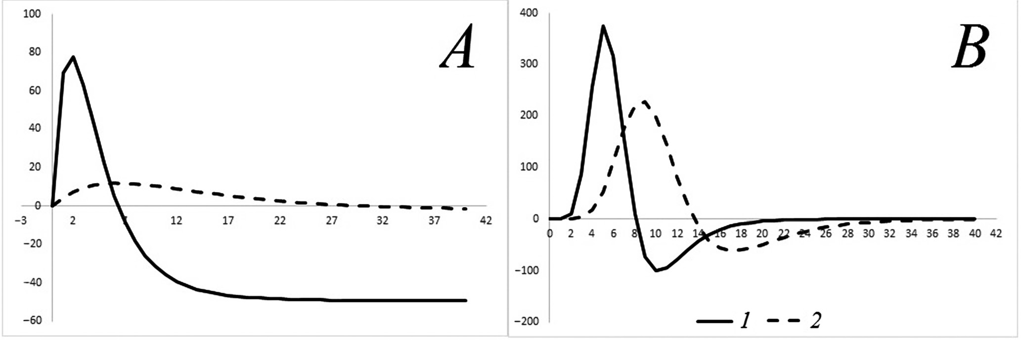 Рис. 4. Максимальная продолжительность жизни Heliometra glacialis (Owen 1833 ex Leach MS), вычисленная для исследованной выборки из Баренцева моря по минимальному значению второй производной на основе параметров уравнений Берталанфи (A) и Гомперца (B): 1 – построена по средним значениям параметров индивидуального роста, 2 – построена по параметрам группового роста. По оси абсцисс указана продолжительность жизни, годы; по оси ординат – вторая производная.