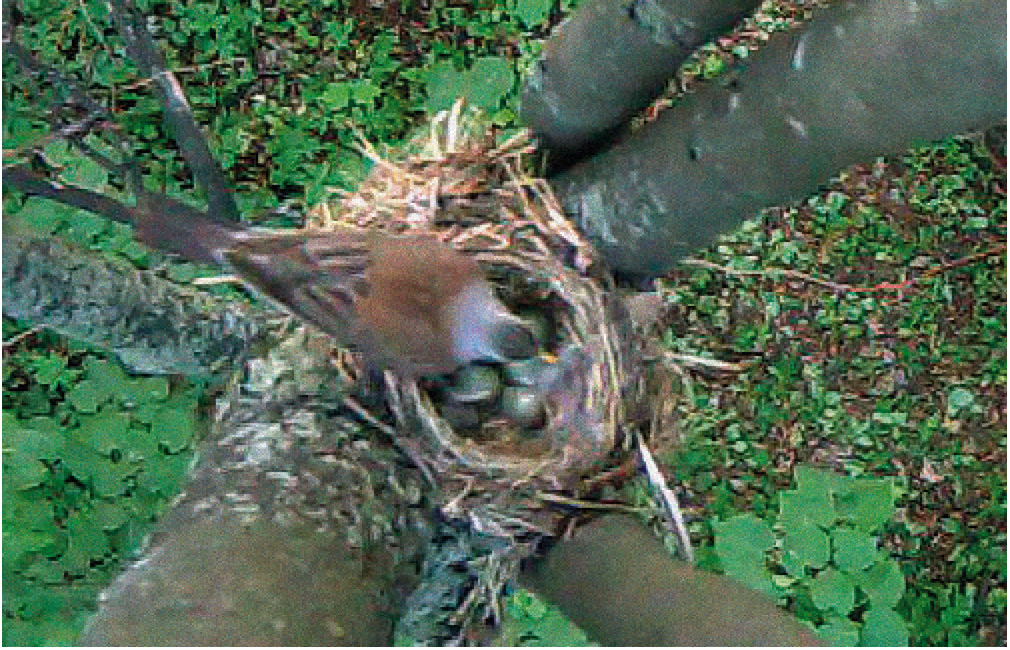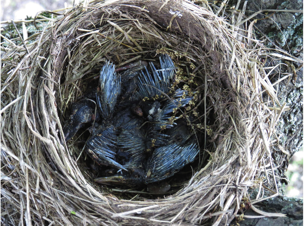 Рис. 2. Гнездо рябинника с давними, хорошо сохранившимися останками птенцов в возрасте ~6–7 суток, погибшими предположительно во время непогоды 8–10 мая 2017 г. (спорткомплекс МГУ, Воробьевы горы, Москва, 7 июня 2017 г.; фото автора).