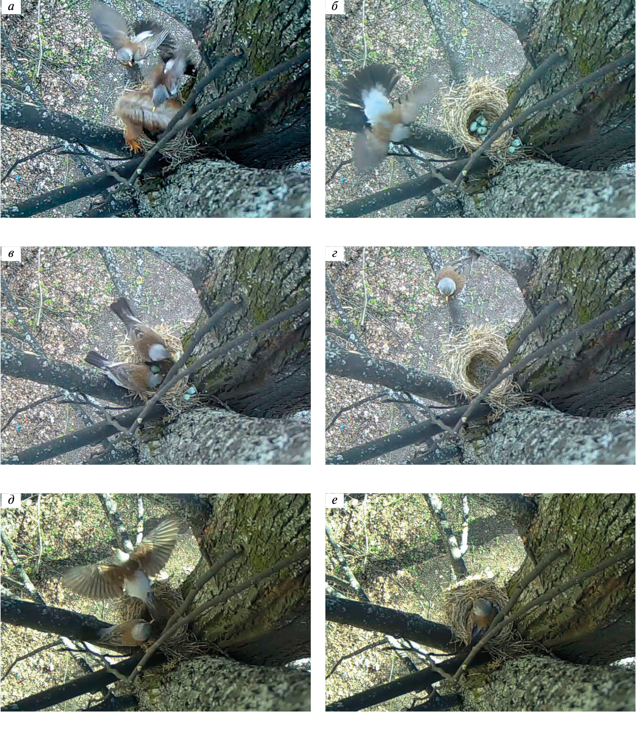 Рис. 6. Действия пары рябинников во время и после уничтожения их кладки обыкновенной белкой (возле Химического факультета МГУ, Воробьевы горы, Москва, 3 мая 2017 г.; кадры видеозаписей, сделанных фотоловушкой Seelock Spromise S128): а – пара птиц атакует белку (6:09); б – гнездо сразу после уничтожения кладки (6:10); в – во время поедания обоими родителями скорлупы яиц самец (сверху) взял в клюв крупный фрагмент скорлупы, чтобы вынести его из гнезда (6:12); г – гнездо через 30 мин после ухода белки, после ликвидации родителями следов ее нападения (6:40); д, е – самка “вытеснила” из лотка забравшегося туда самца (д – он улетает) и уселась в пустое гнездо (е) (8:32).