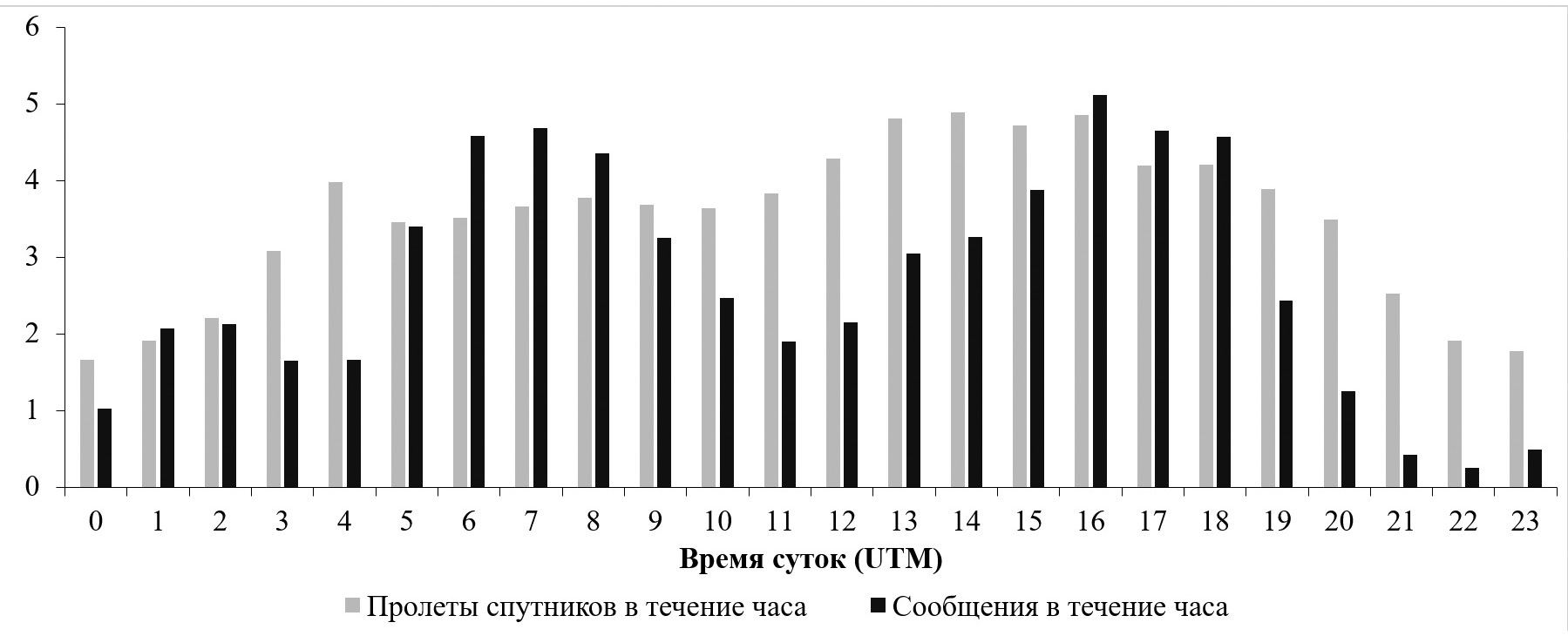 Результаты анализа демонстрируют высокую степень зависимости успешности приема сообщений от высоты траектории спутников, а также от интенсивности их появления выше 10° над линией горизонта. Анализ траекторий орбит спутников показал, что наблюдается высокая неравномерность интенсивности пролета спутников над линией горизонта на высоте, достаточной для уверенного приема сообщений. Наибольшее влия- ние эти факторы оказывают на успешность приема сообщений в период с 20:00 до 01:00 UTM, когда в течение часа на высоту более 10° над линией горизонта поднимаются от 0 до 3 спутников. При этом в этот период в течение часа три спутника имеют максимальный угол подъема над горизонтом выше 10° лишь в 2% случаев, а в 26% случаев спутники на данной высоте не наблюдаются. Следует также заметить, что 25% пролетов в этот период приходятся на инновационный французский микроспутник-демонстратор ANGELS (А1), эффективность приема сообщений которым минимальна. Поэтому, несмотря на то, что ошейник регулярно передает по 24 сообщения в течение часа, в указанный период в течение часа в среднем получено 0.74 ± 0.05 сообщений с одного действующего ошейника, то есть около 3.1% от количества переданных. Периоды наилучшего приема сообщений приходятся на временны́е промежутки с 05:00 до 10:00 и с 16:00 до 19:00 UTM. В указанные периоды только в 3.4% случаев в течение часа над горизонтом поднимался только один спутник, имеющий максимальный угол подъема более 10°, а в 57.3% случаев таких спутников наблюдалось от 4 до 8. В результате для этих временны́х промежутков характерна высокая успешность приема сообщений. В среднем в течение часа принято 4.51 ± 0.10 сообщений, около 18.8% от количества переданных ошейниками.