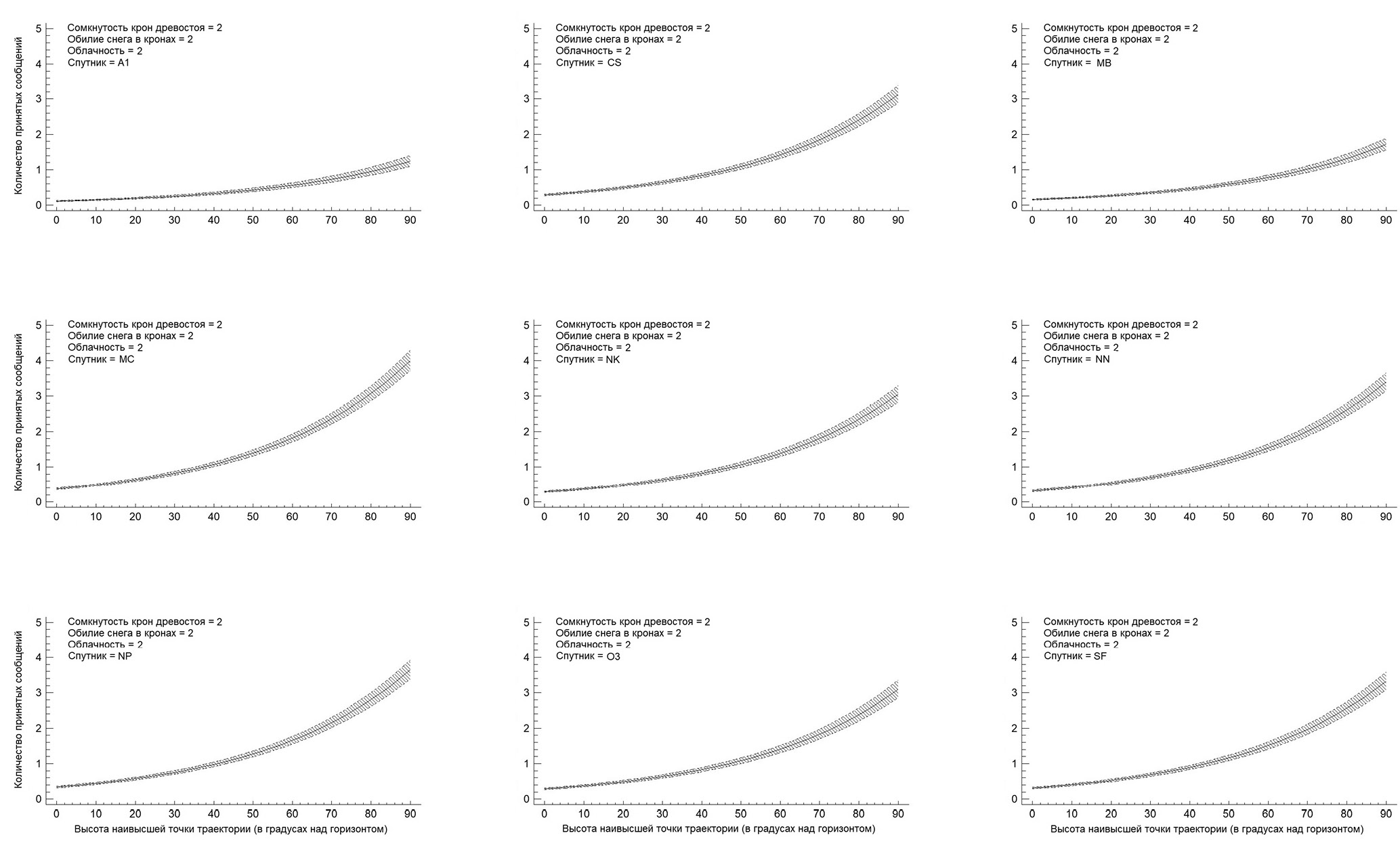 Для анализа влияния высоты траектории и модели космического аппарата на успешность приема сообщений, передаваемых ошейником, была построена обобщенная линейная модель регрессии Пуассона на основе данных о распределении количества сообщений, полученных за один пролет спутника. В анализ включены следующие факторы: высота траектории спутника над горизонтом, азимут на наивысшую точку траектории спутника, модель спутника, облачность, наличие осадков, сомкнутость крон деревьев и наличие кухты. Количество сообщений оценивалось индивидуально для каждого ошейника, так как передающие устройства при одном и том же пролете спутника могли находится в разных типах местообитаний, отнесенных к разным категориям сомкнутости крон. Всего в анализ включено 11 708 пролетов девяти спутников. Во время 4772 пролетов спутники приняли от 1 до 5 сообщений. Всего принято 8139 сообщений. На основе информационного критерия Akaike выбрана модель, включающая 5 факторов: высоту траектории, модель спутника, облачность, сомкнутость крон и наличие кухты.
