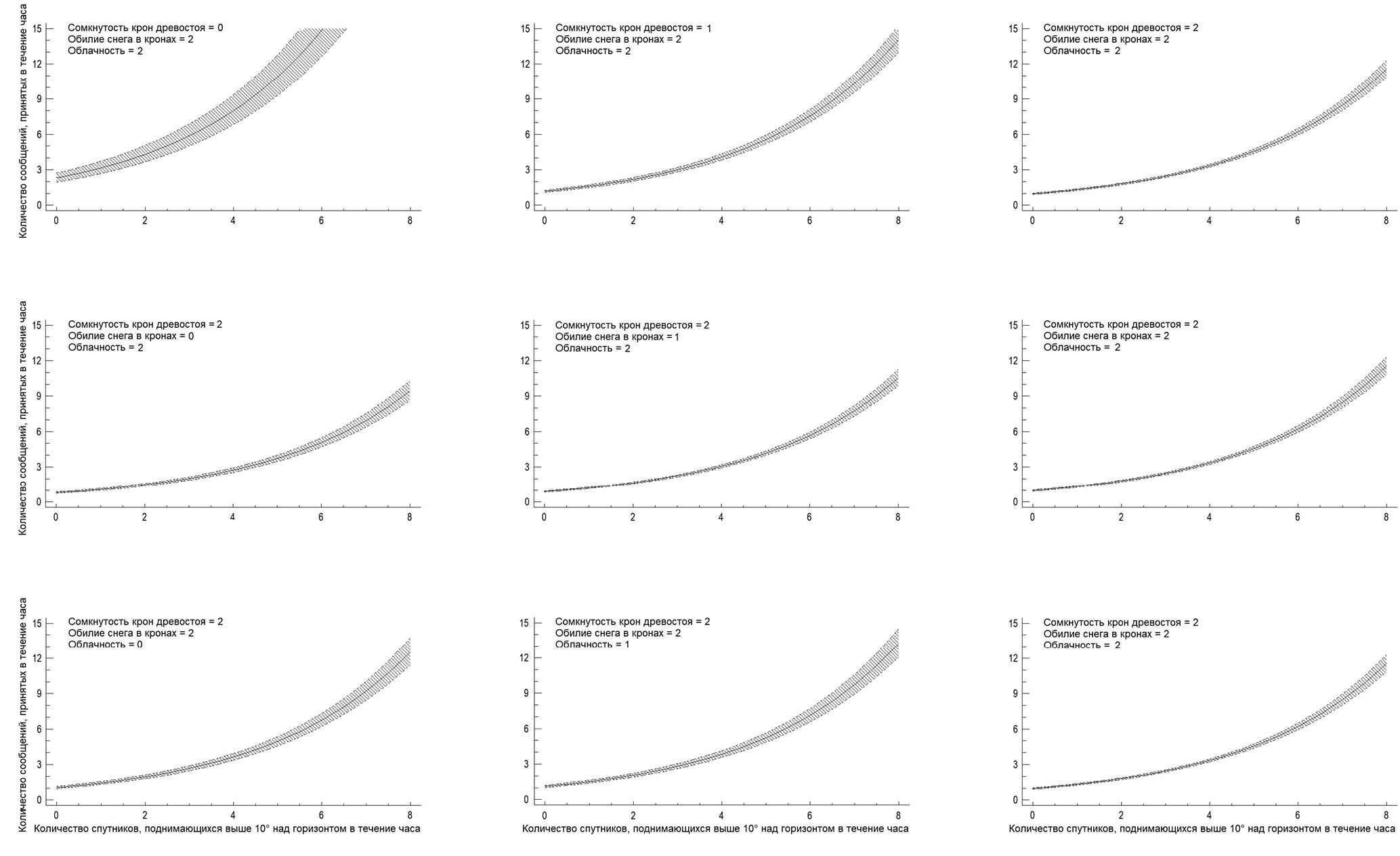 Вторая модель рассматривает влияние интенсивности пролета спутников и природных факторов на количество полученных сообщений. В течение часа количество спутников над горизонтом варьировало от 0 до 9, количество спутников, имеющих максимальный угол подъема над горизонтом более 10°, – от 0 до 8, количество принятых сообщений – от 0 до 14. На основе информационного критерия Akaike выбрана модель, включающая 4 фактора: количество спутников, имеющих максимальный угол подъема над горизонтом более 10°; облачность; сомкнутость крон и наличие кухты.