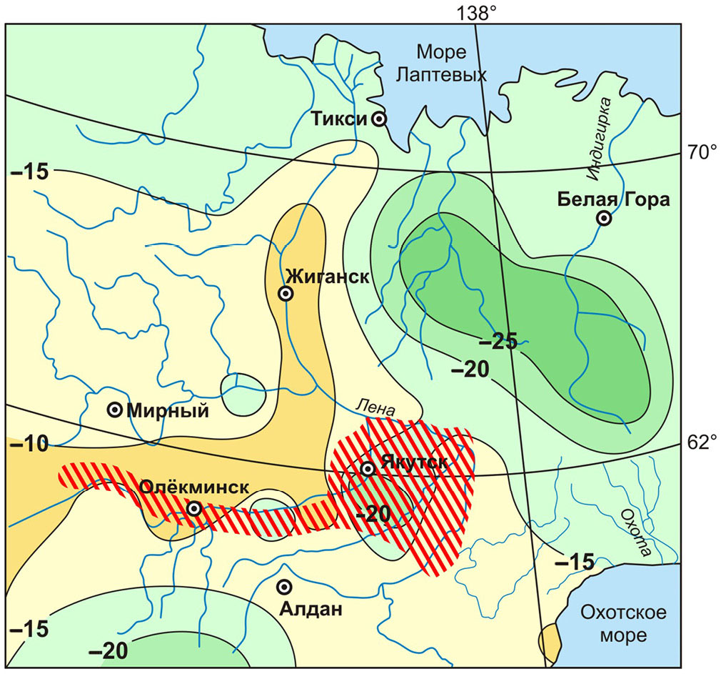 Рис. 6. Изотермы многолетних минимальных температур в почве на глубине 20 см (из: Berman et al., 2016 с изменениями; Springer Nature License № 5835710123397) и территория, на которой отмечены вспышки численности сибирского коконопряда (Dendrolimus sibiricus) в Республике Саха (Якутия) (обозначена красной штриховкой, по: Аммосов, 1971, 1978; Винокуров, Исаев, 2002; Гниненко, Седельник, 2003; Каймук и др., 2005; Чикидов и др., 2010; Бурнашева и др., 2021).