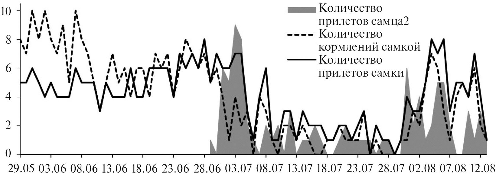 Появление чужака сильно повлияло на поведение самки. С 1 по 4 июля количество ее вылетов еще сохранялось на прежнем уровне, но количество кормлений заметно уменьшилось из-за того, что ее сгонял чужак (рис. 2). В 68% прилетов самки со 2 по 4 июля сразу за ней прилетал и чужак. С 5 июля самка стала прилетать реже и времени в гнезде проводила все меньше и меньше (табл. 2, рис. 1). Создавалось впечатление, что таким образом самка старалась меньше привлекать чужака к гнезду, чтобы он не травмировал и не выбросил из гнезда птенцов. Похоже, ее тактика сработала: с 5 по 30 июля чужак бывал в гнезде гораздо реже (рис. 2) и проводил там меньше времени (средняя длительность нахождения в гнезде в один прилет сократилась с 9.5 ± 2.8 до 6.4 ± 1.6 мин). Со 2 июля по 13 августа самка не ночевала в гнезде 1, за исключением 3, 11 и 12 июля. Было два дня, когда самка совсем не прилетала в гнездо (25 и 29 июля), и еще шесть дней – когда прилетала, но ни разу не кормила. В последних случаях кормить мешал прилет чужака. В августе количество прилетов и кормлений увеличилось. Возможно, это связано с меньшим вниманием со стороны чужака. С 1 по 12 августа он прилетал на гнездо вслед за самкой лишь в 17% ее прилетов.