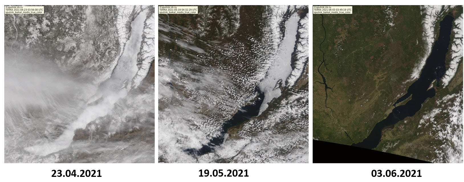 Сроки разрушения льдов на озере Байкал в 2019 и 2021 гг. были сходны: начало освобождения акватории ото льдов (появление первых проталин на южной части озера) пришлось на 18.04.2019 и 24.04.2021, полное отсутствие льдов наблюдалось 02.06.2019 и 03.06.2021. Динамику и скорость таяния льда также можно считать сопоставимыми.