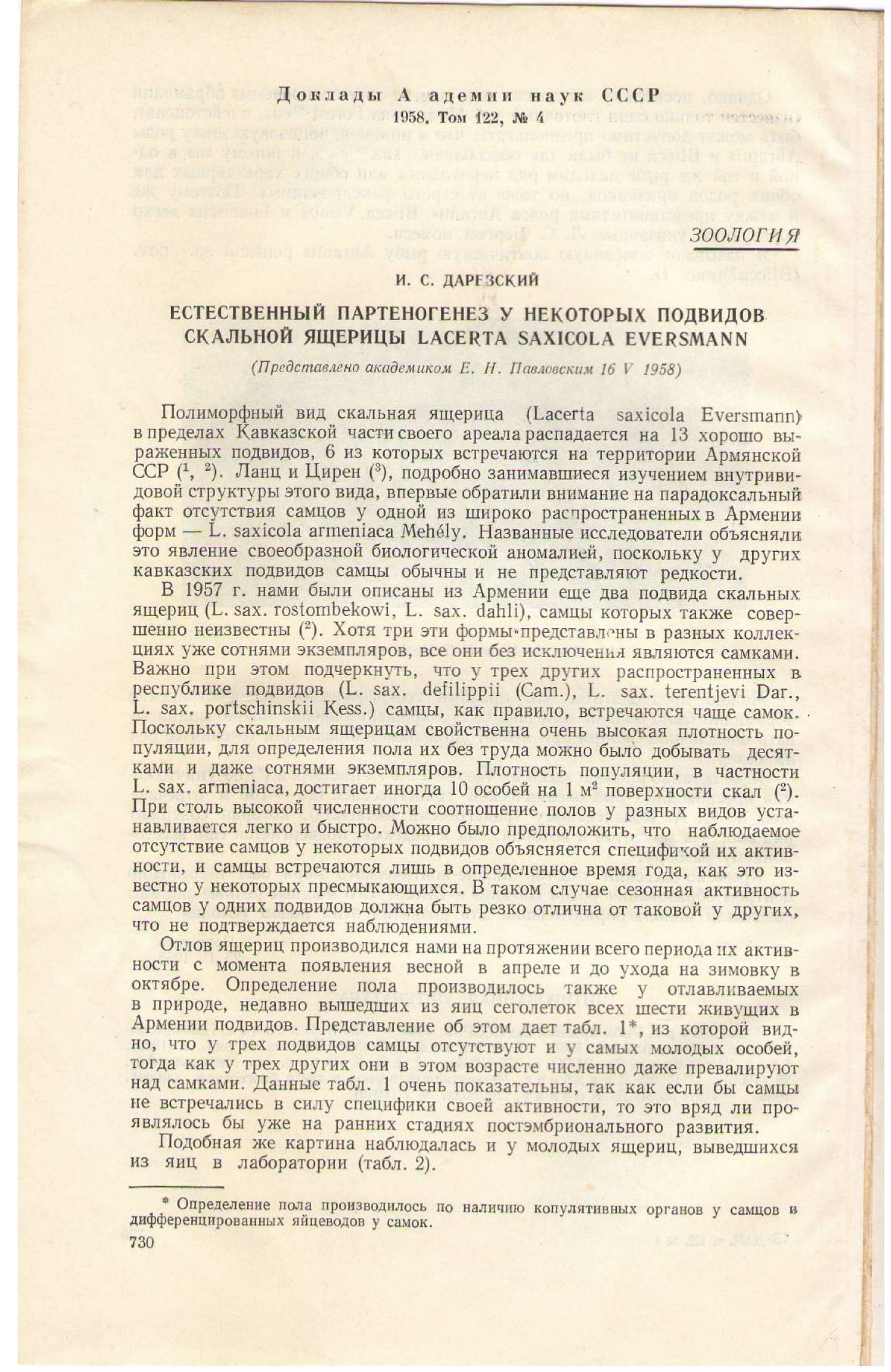 1 октября 1958 г. в “Докладах АН СССР” (рис. 1) была опубликована небольшая статья тогда еще не очень известного 33-летнего герпетолога из Еревана, всего лишь немногим больше года назад окончившего заочную аспирантуру в ЗИН АН СССР. В статье И. С. Даревского были приведены доказательства наличия партеногенеза в природной популяции скальной ящерицы Lacerta saxicola armeniaca Méhely, 1909; сейчас эта ящерица считается самостоятельным видом Darevskia armeniaca (Méhely, 1909); см. рис. 2. Доказательство столь серьезного утверждения строилось на отсутствии самцов в природе и на получении только самочного потомства от неоплодотворенных самок. Это была смелая заявка на важное открытие в области герпетологии (и, добавлю, зоологии позвоночных в целом).
