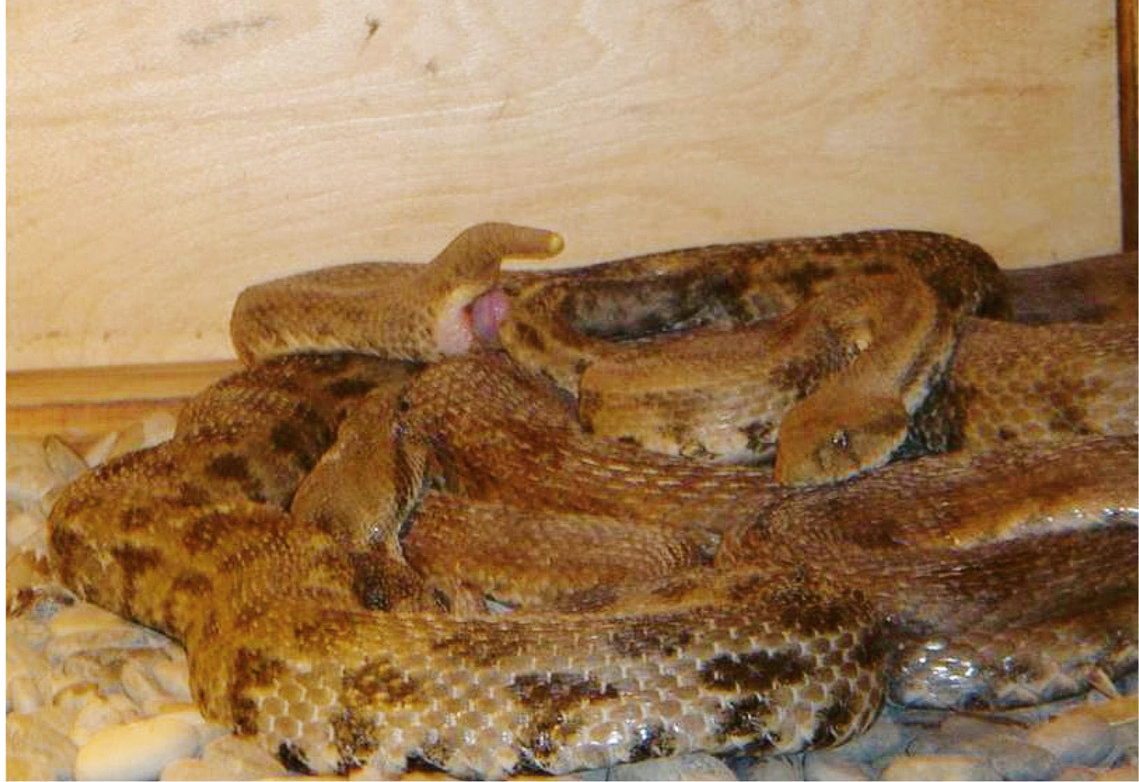 В Дагестане гюрза активна с марта–апреля до октября–ноября, в зависимости от погодных условий. В годы с обычными условиями первые особи выходят из спячки во второй половине марта, когда дневные температуры держатся около +10°С, а массовый выход начинается во второй половине апреля. Первыми появляются самцы, а через несколько дней самки. Первое время гюрзы неактивны, держатся группами возле зимовок (Султанова, 2011; Мазанаева, 2013). Период активного спаривания начинается в середине мая и продолжается до второй половины июня. Нами были проведены наблюдения за брачным поведением и спариванием гюрз как в природе, так и в условиях террариума. В долине р. Количи в первую половину дня 10.05.2009 г. самка лежала, свернувшись кольцом, самец ползал вокруг нее и совершал монотонные движения, приподняв переднюю четверть тела и время от времени потирая самку головой. По-видимому, таким образом он побуждал ее к спариванию. По истечении получаса произошло спаривание, которое продолжалось около 30 мин, затем змеи расползлись. В условиях террариума спаривание гюрз наблюдали 19.05.2009 г., которое также продолжалось около 30 мин (рис. 1).