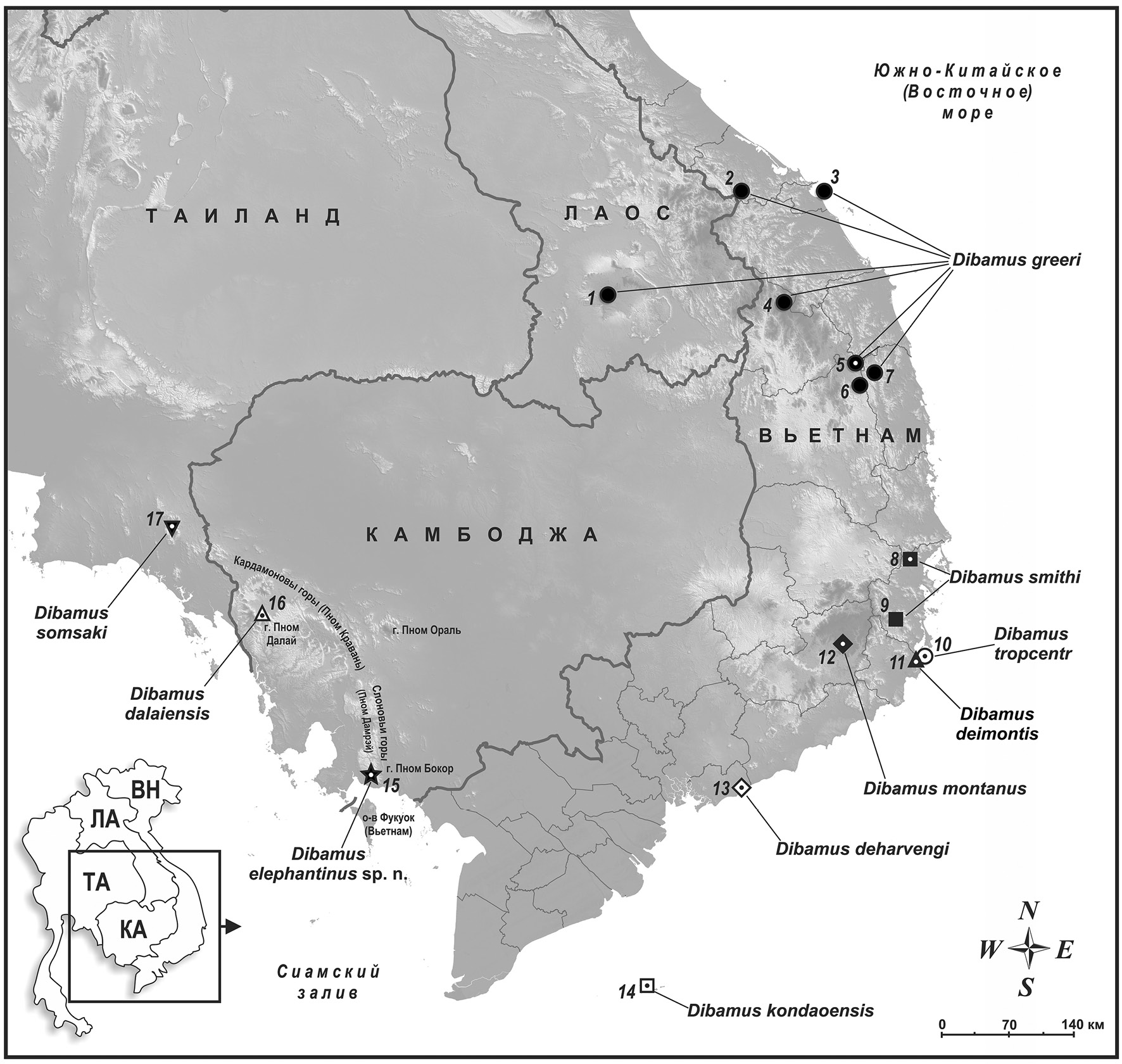 Рис. 1. Распространение представителей рода Dibamus в южном Индокитае. Типовые территории видов обозначены точкой в центре маркера локалитета. Сокращения: КА – Камбоджа, ВН – Вьетнам, ЛА – Лаос, ТА – Таиланд. Локалитеты: Лаос: 1 – район Паксонг, пров. Чампасак (FMNH 258662); Вьетнам: 2 – Заповедник Саола, район Алыой, пров. Тхуатьен-Хюэ (Nguyen et al., 2009); 3 – Заповедник Сонча, Дананг (Phan et al., 2021); 4 – Заповедник Нгоклинь, пров. Дананг (Le et al., 1999); 5 – Заповедник Контюранг и дер. Тямлап, пров. Зялай (Darevsky, 1992); 6 – Буонлыой, пров. Зялай (Darevsky, 1992); 7 – охраняемый лес Антоан, пров. Биньдинь (ZMMU NAP-16013); 8 – Дабан, р-н Ниньхоа, пров. Кханьхоа (Greer, 1985; Darevsky, 1992); 9 – Заповедник Хонба, пров. Кханьхоа (Бобров, 2008); 10 – гора Давать и р. Ныокнгот, нац. парк Нюйтюа, пров. Ниньтхуан (Kliukin et al., 2023); 11 – гора Нюйтюа, нац. парк Нюйтюа, пров. Ниньтхуан (Kliukin et al., 2024); 12 – Ле Боскэ (Le Bosquet), город Далат, пров. Ламдонг (Smith, 1921); 13 – Заповедник Биньтяу-Фыокбыу, пров. Бария-Вунгтау (Ineich, 1999); 14 – нац. парк Кондао, пров. Бария-Вунгтау (Honda et al., 2001); Камбоджа: 15 – гора Пном Бокор, нац. парк Бокор, пров. Кампот (настоящая статья); 16 – гора Пном Далай, Природный резерват Пном Самкос, пров. Пурсат (Neang et al., 2011); Таиланд: 17 – Природный резерват Кхао Сойдао, пров. Чантхабури (Honda et al., 1997).