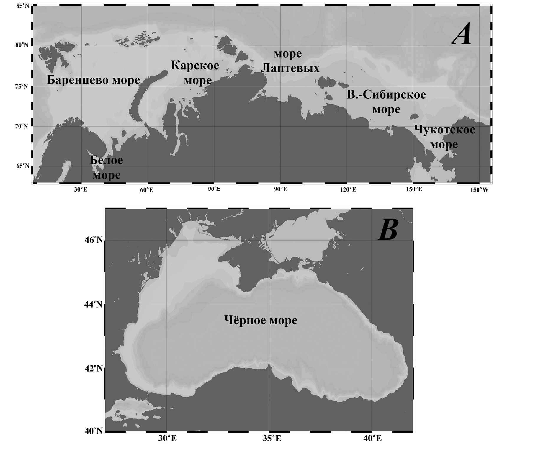 Район исследования включает в себя моря, омывающие берега Российской Федерации. Моря Северного Ледовитого океана – Баренцево, Белое, Карское, Лаптевых, Восточно-Сибирское и Чукотское (рис. 1А), а также Черное море рассматриваются в работе в географических границах (рис. 1B). Для морей Дальнего Востока в основном анализируются районы, приведенные на рис. 2.
