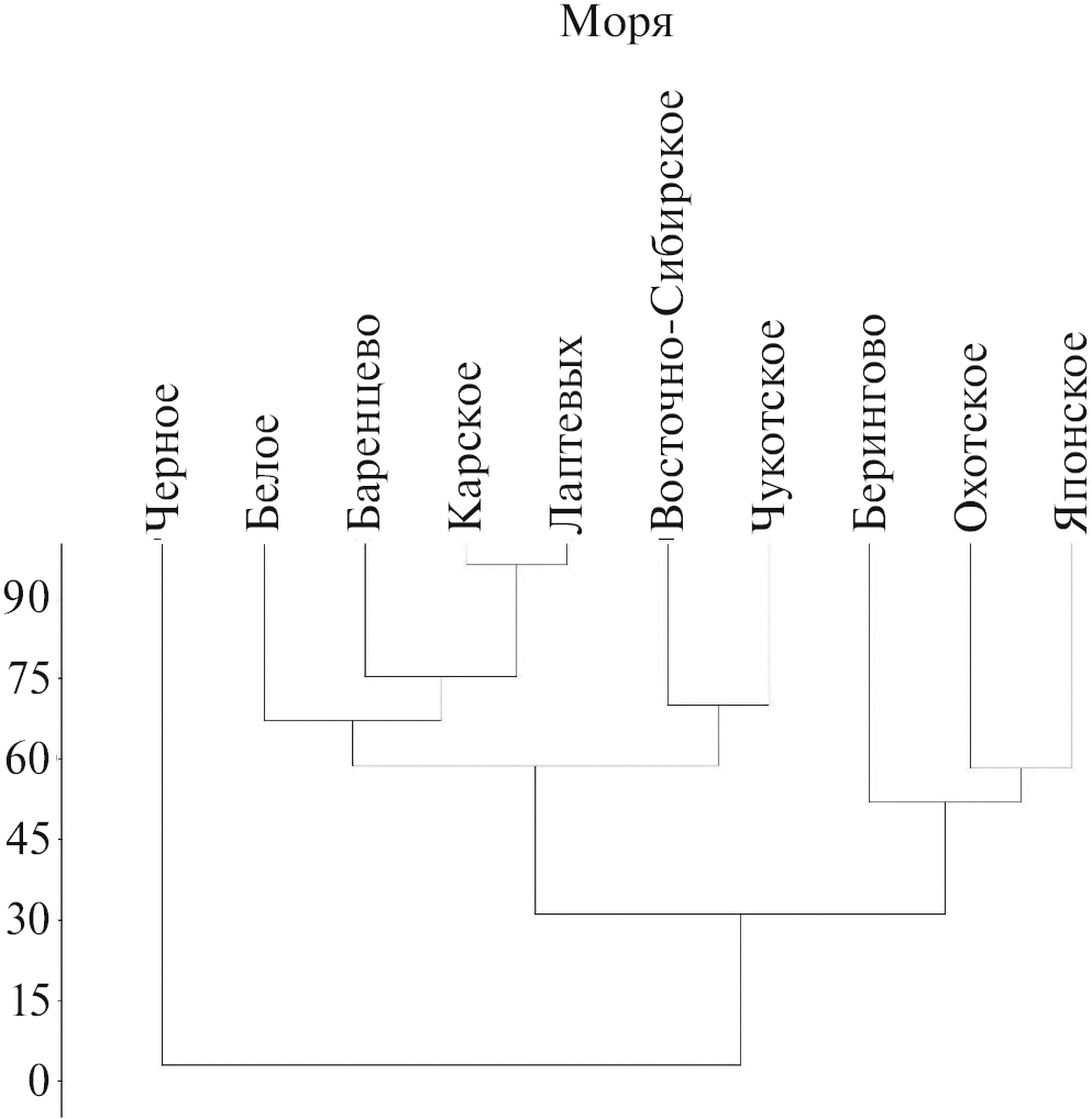 Примечание. По диагонали указано количество видов для каждого из морей, под диагональю приведены коэффициенты сходства Серенсена–Чекановского.