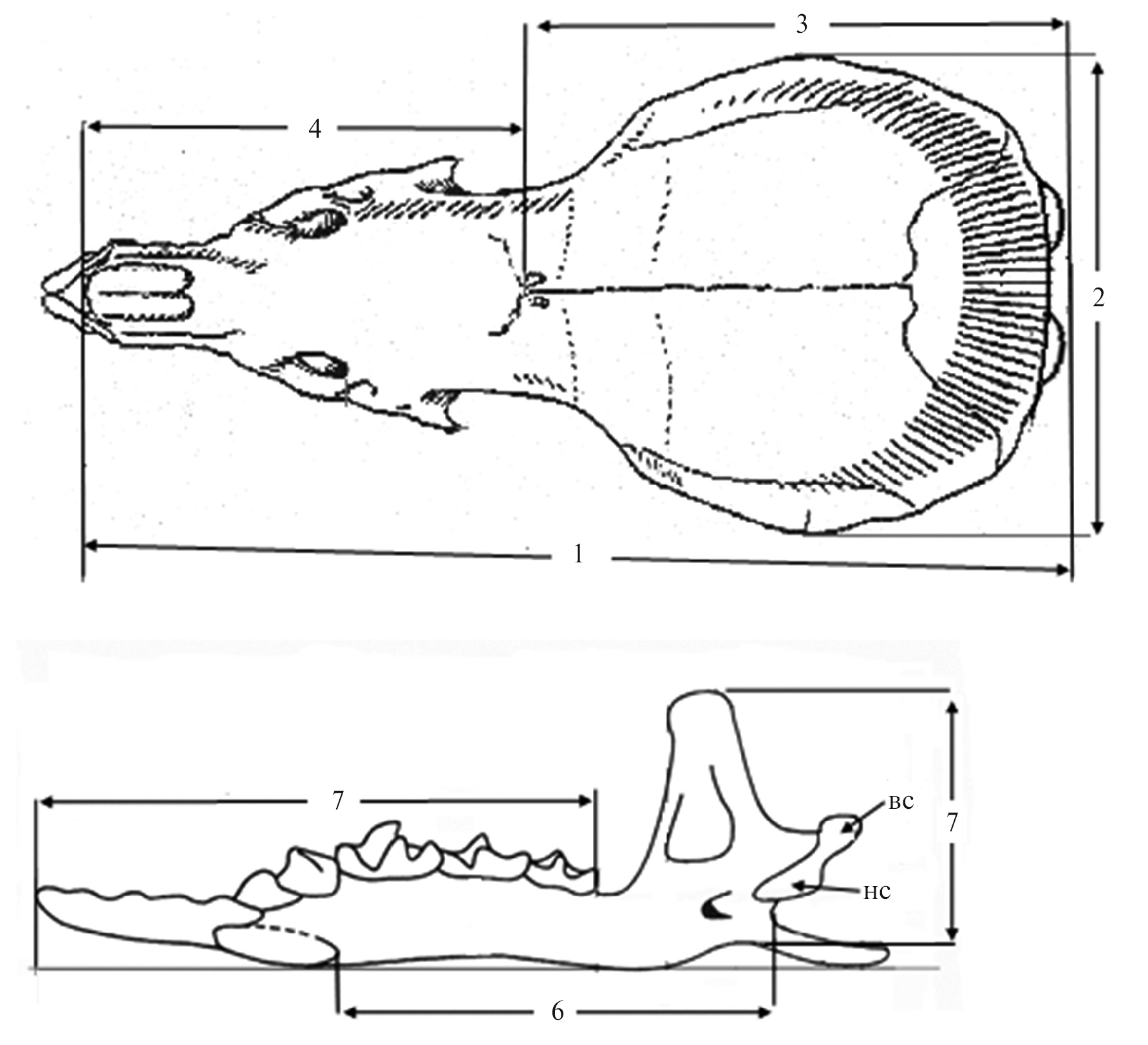 Краниометрическая изменчивость челюстного аппарата обыкновенной бурозубки оценивалась по семи признакам черепа, по которым сравниваемые выборки различаются в наибольшей степени (Бобрецов и др., 2020) (рис. 2): 1 – кондилобазальная длина черепа (КБД) – расстояние от заднего края затылочных мыщелков до переднего края верхнечелюстной кости, точка gnathion. Затылочное отверстие на черепах землероек сдвинуто назад и мыщелки (как часть затылочной кости, occipitalis) являются задней частью осевого черепа; 2 – расстояние между наиболее выдающимися точками боковых сторон этого отдела черепа (ШЧ); 3 – длина мозговой части черепа (ДМЧ) – расстояние от переднего края надглазничных отверстий до заднего края затылочной. Этот промер получали путем вычитания ДЛЧ из КБД; 4 – длина лицевой части черепа (ДЛЧ) – расстояние от переднего края надглазничных отверстий до переднего края верхнечелюстной кости; 5 – высота нижней челюсти (высота восходящей ветви нижней челюсти) (ВНЧ) – расстояние от вершины венечного отростка до нижнего края челюсти в области отхождения углового отростка, вид с лингвальной стороны челюсти; 6 – основная длина нижней челюсти, длина нисходящей ветви нижней челюсти (ДОНЧ) – расстояние от основания нижнего резца до заднего края челюсти между угловым и сочленовным отростками; 7 – длина нижнего зубного ряда (ДНЗР) – наибольшая длина нижнего зубного ряда вместе с резцом. Промеры взяты с верхней стороны осевого черепа и с лингвальной стороны нижней челюсти.