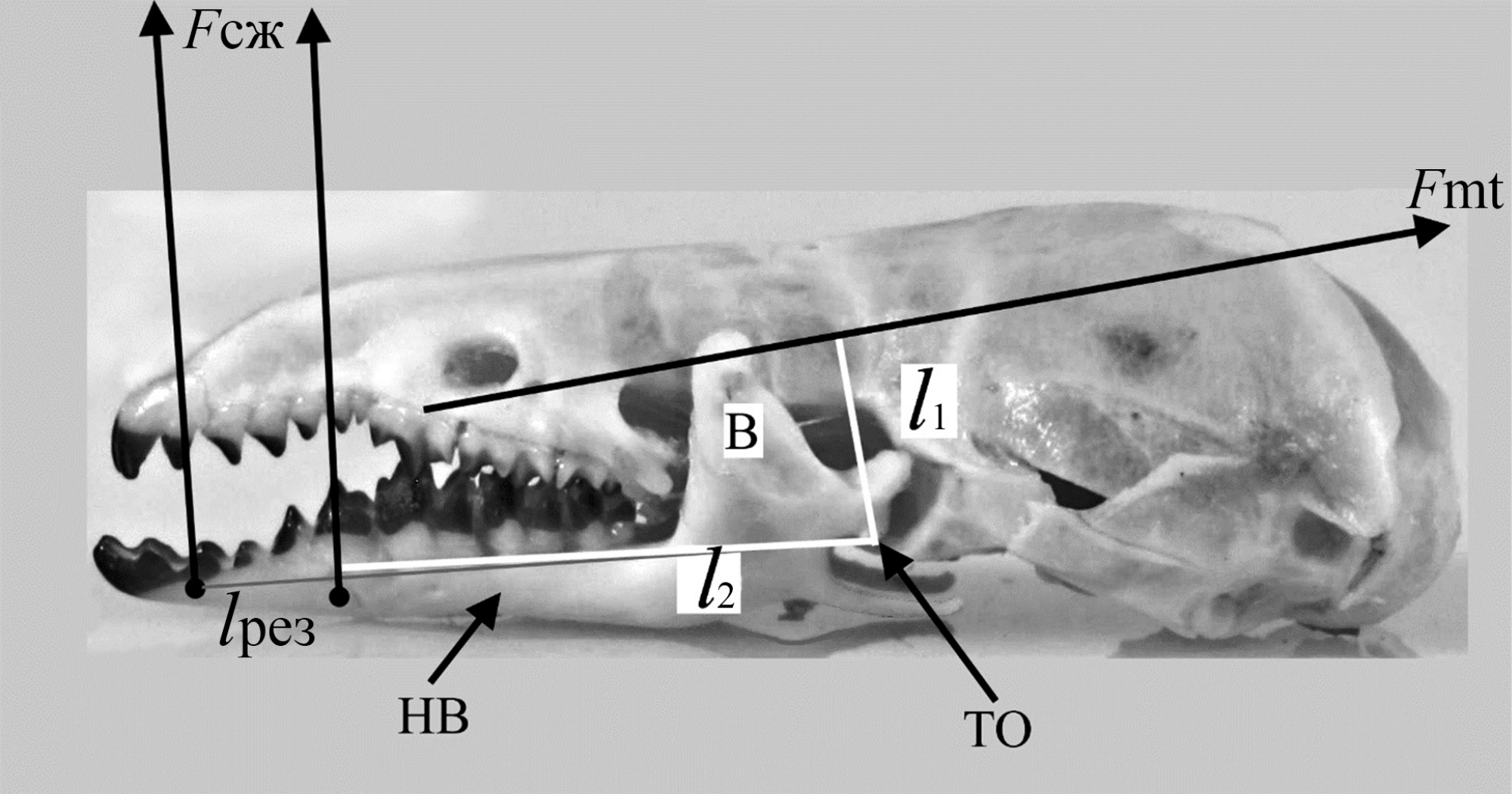 В рычаге первого рода существует равенство двух моментов сил – m1 = Fmt х l1 и m2 = Fсж × l2. Поэтому вертикально направленная сила сжимания челюстей (Fсж) увеличивается при увеличении плеча l1 при сохраняющейся длине плеча l2 либо увеличивается при уменьшении плеча l2 и сохраняющейся длине плеча l1. Чем ближе к суставу, тем больше будет сила сжимания при сохранении постоянства массы аддукторов. Вследствие этого сила сжимания челюстей максимальна на коренных зубах (бурозубки разгрызают хитин жуков коренными зубами) и уменьшается на одновершинных зубах и резцах (Никольский, 1990).