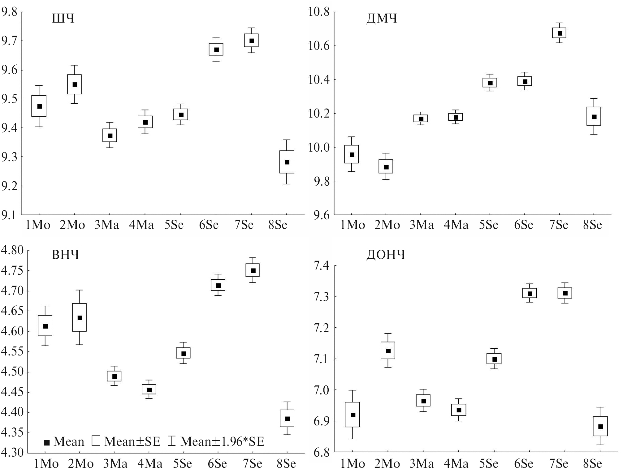 Средние значения высоты нижней челюсти (ВНЧ) в выборках расы Мантурово оказались самыми низкими по сравнению с другими расами, за исключением расы Серов в тундре. Размеры длины нижней челюсти (ДОНЧ) и длины нижнего зубного ряда (ДНЗР) бурозубок расы Мантурово также значительно меньше, чем у бурозубок расы Серов на равнине (p < 0.001) и не отличаются от бурозубок этой расы из тундры. При этом по соотношению высоты и длины нижней челюсти (ВНЧ / ДОНЧ) выборки расы Мантурово сходны с выборками расы Серов на равнине и в предгорьях, но достоверно меньше, чем в горах (p < 0.01) и превосходят бурозубок расы Серов из тундры (p < 0.05).