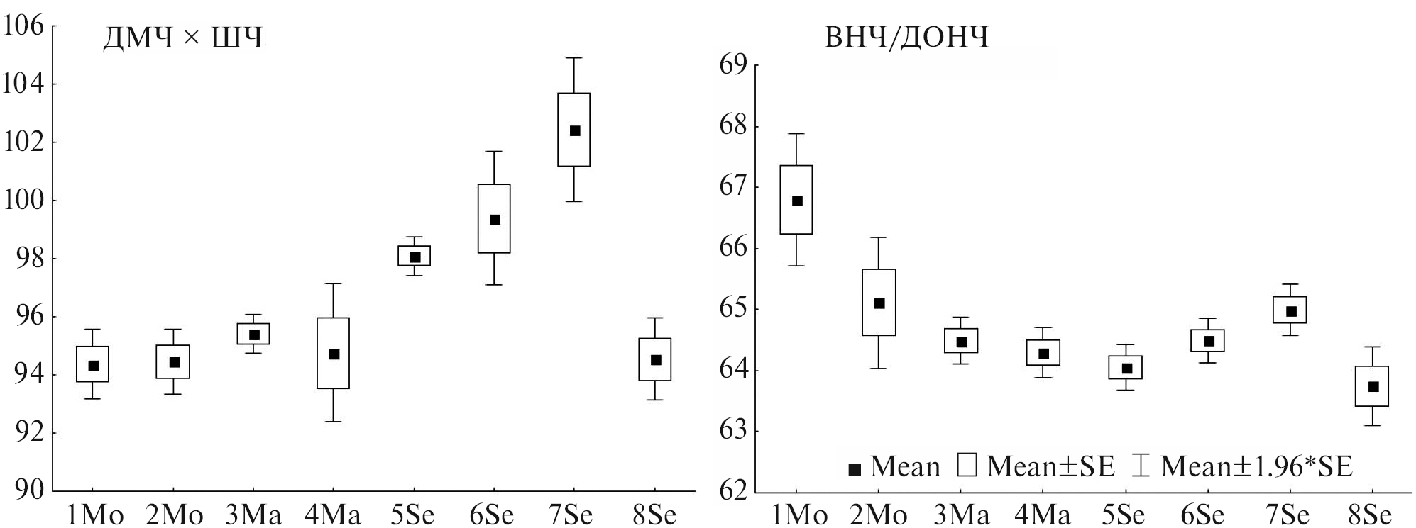 ВНЧ / ДОНЧ | 64.49 ± 0.20 | 64.30 ± 0.21 | 66.80 ± 0.55 | 65.12 ± 0.55 |