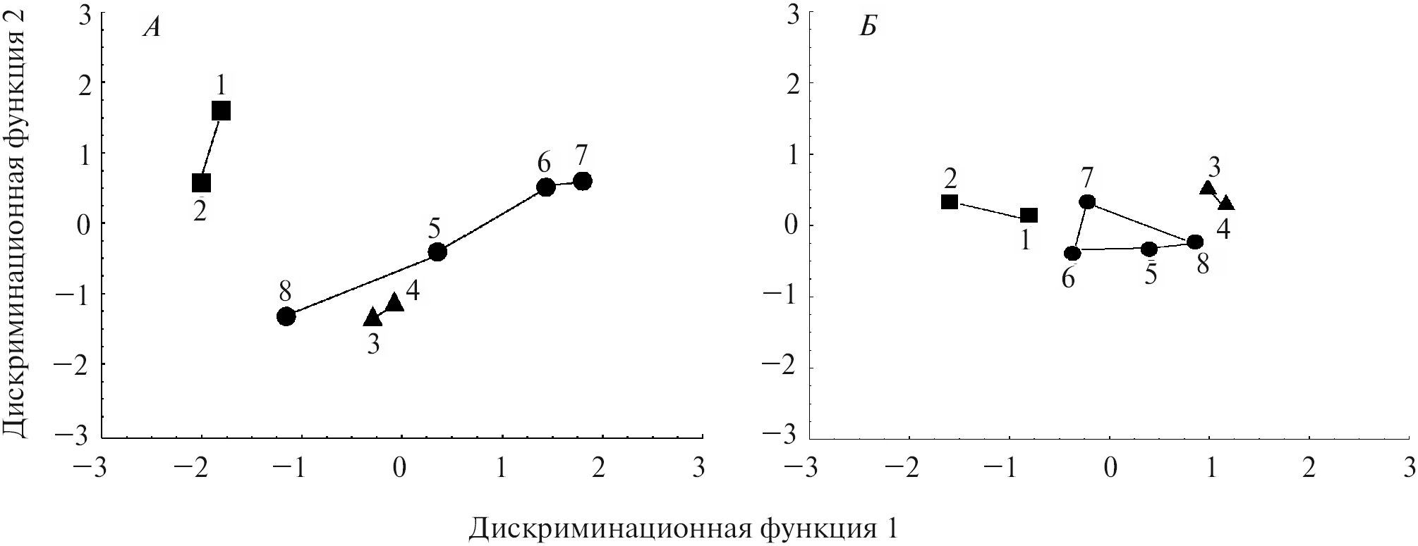 Для выявления различий между разными выборками по всем признакам применяли канонический дискриминантный анализ (Тюрин, Щеглов, 2015). При этом использовали пошаговую процедуру отбора признаков. Этот метод позволяет выделить наиболее информативные признаки и их сочетания. Степень различий между выборками (их центроидами) рассчитывалась на основе расстояний Махаланобиса, которые являются в данном случае обобщенными морфологическими дистанциями. Вся статистическая обработка материала выполнена в программе STATISTICA 6.0 для Windows.