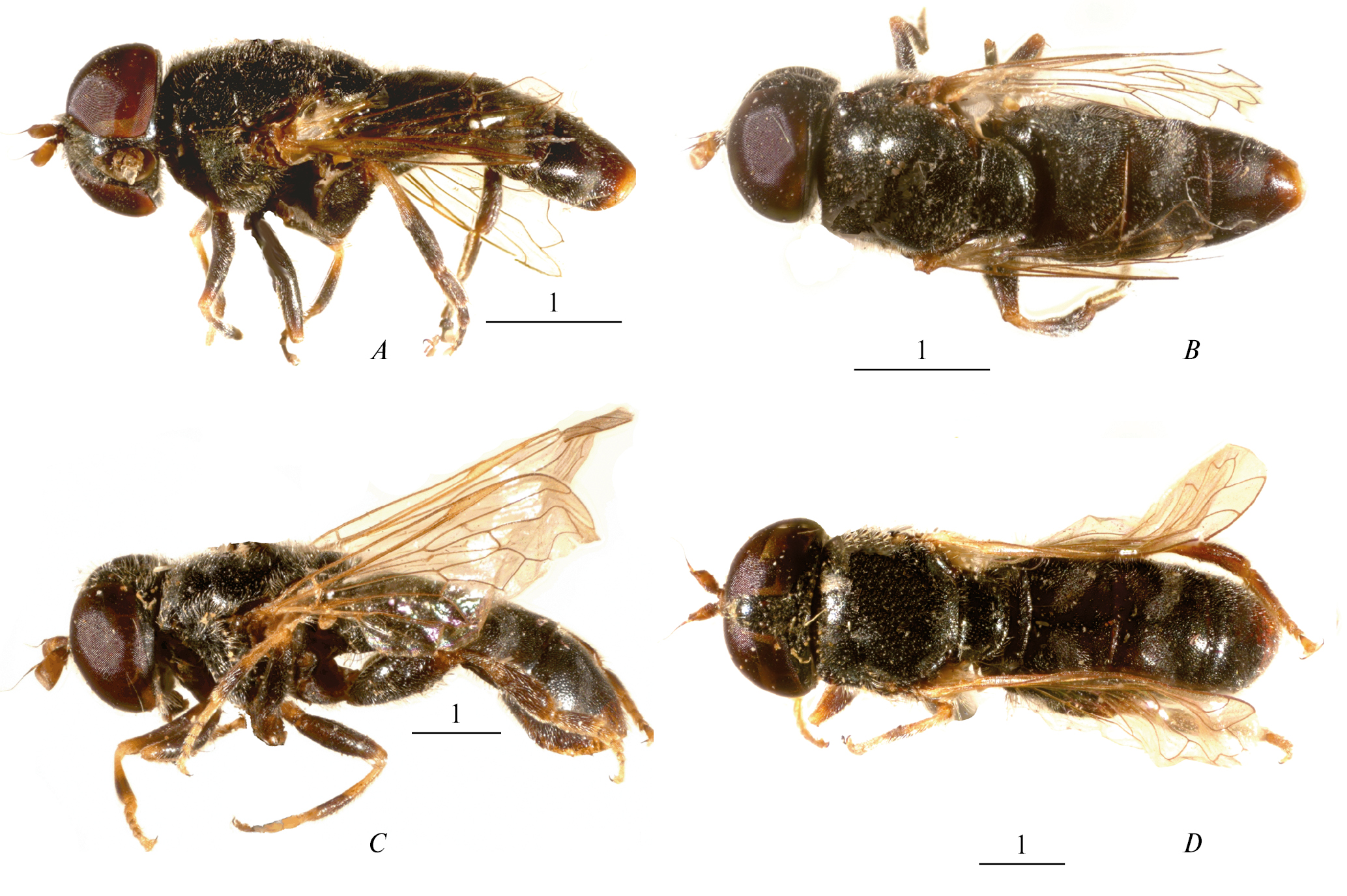Рис. 3. Eumerus glabropterus sp. n. (A–B) и Eumerus acuticornis Sack (C–D). A, C – вид сбоку; B, D – вид сверху. Размеры приведены в миллиметрах.