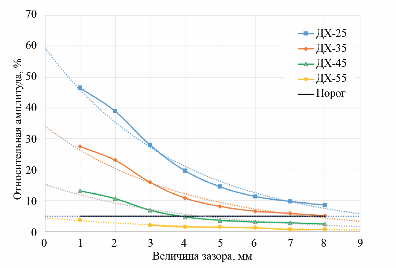Как видно из рис. 11, при увеличении зазора между полюсами электромагнитов и пером подошвы рельса на каждый 1 мм относительная амплитуда сигнала на ДХ снижается примерно на 10 %. Полученные данные качественно согласуются с [22]. Легенда на графике обозначает расстояние ДХ от края пера, например, график «ДХ-35» соответствует расположению датчика на расстоянии 35 мм от края пера.