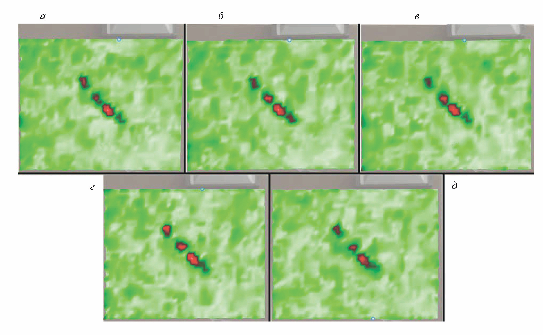Фактически, в процессе работы магнитострикционного преобразователя в контролируемое изделие вводят упругие волны в диапазоне частот от 20,8 до 21,5 кГц, максимальная амплитуда сигнала составляла 60 мкм/с на частоте 21,06 кГц. Следует отметить, что незначительное изменение амплитуды колебаний в околорезонансном диапазоне приводит к возбуждению колебаний различных частей дефекта, что может быть зарегистрировано лазерным виброметром на соответствующих частотах. В связи с этим для синтеза данных в ПО DeFinder были выбраны виброграммы на частотах 21250, 21312, 21375, 21438 и 21531 Гц (см. рис. 6).