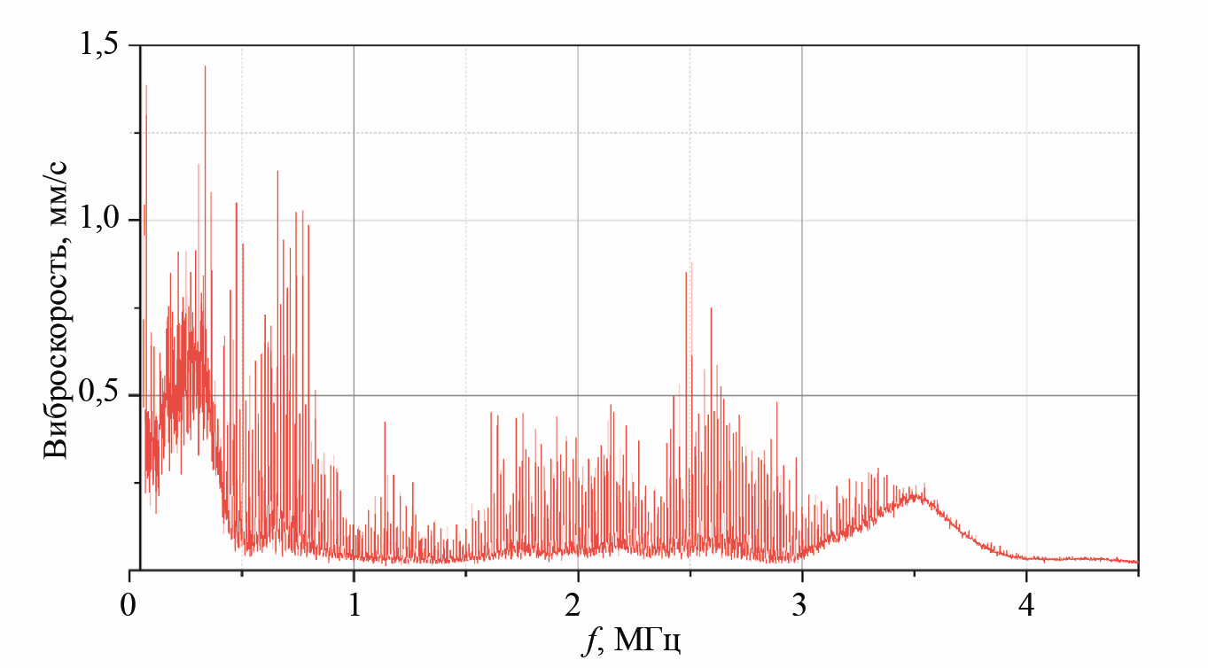 Рис. 4. Спектр колебаний на поверхности мембраны ГЭАП (отверстие диаметром 1 мм в центре) в диапазоне частот от 100 кГц до 4 МГц