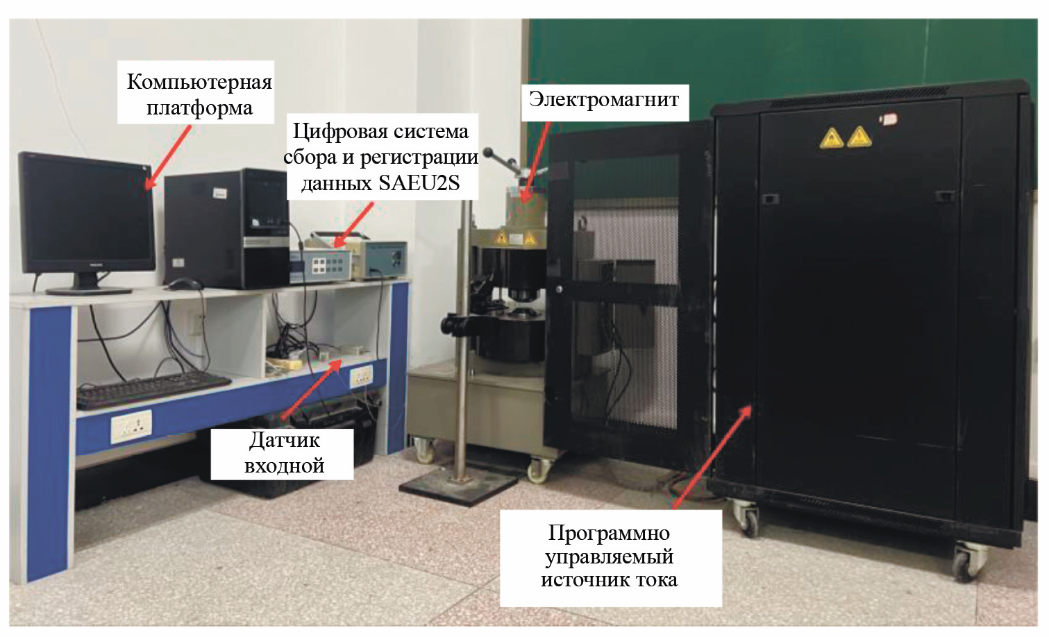 Мы используем цифровую систему сбора данных SAEU2S, электромагнит CH-130, источник тока с программным управлением Model-10030, фронтальный датчик SR150N, усилитель PA и компьютерную платформу для создания нового типа бесконтактного экспериментального устройства EMAE (см. рис. 3), которое обеспечивает инфраструктуру для проведения эксперимента. В частности, источник тока с программным управлением Model-10030 является устройством, обеспечивающим работу всей платформы экспериментальной системы, которая может поддерживать выходной ток в диапазоне от –33 до 33 A и достигать возбуждения напряженности электромагнитного поля до 1,7 T.