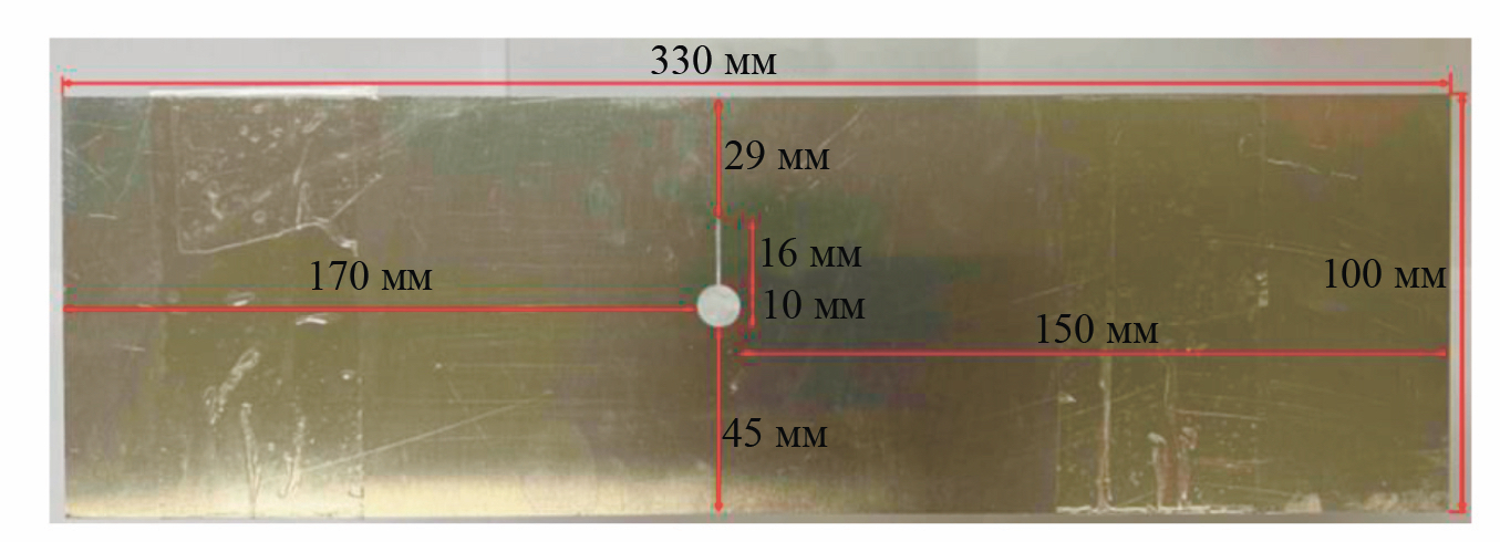 Для изготовления образцов использовали алюминиевый сплав 6061 [37] и магниевый сплав AZ31B [38]. Тип повреждения образца — типичное круглое отверстие на месте трещины, а размеры образца следующие: алюминиевая пластина l × w × h = 330 мм × 100 мм × 1 мм; круглое отверстие d = 10 мм; трещина l × w = 16 мм × 0,3 мм. Размеры образца обозначены на рис. 4.