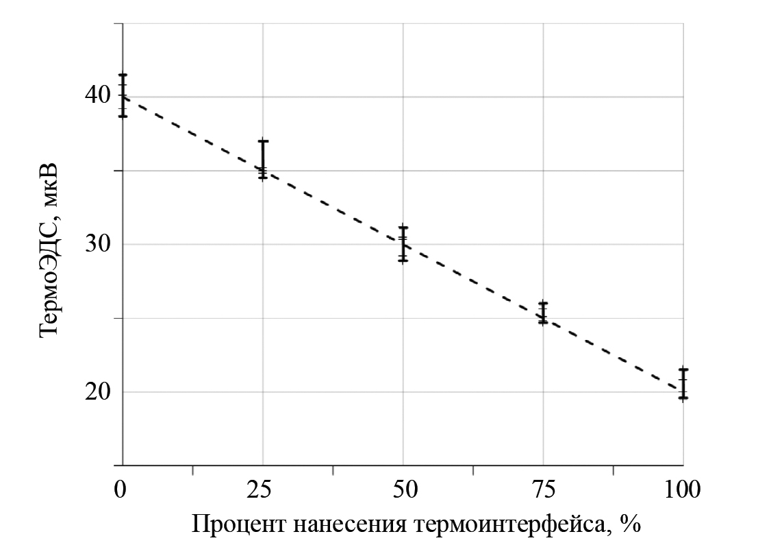 Результаты экспериментальных исследований зависимости термоЭДС от площади покрытия корпуса силового элемента термоинтерфейсом приведены на рис. 15. Авторы выявили практически линейную зависимость.