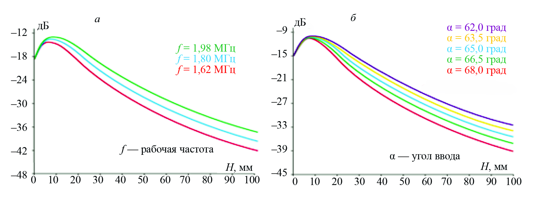 Отметим, что задержку времени δd между зеркально отраженным и наиболее существенным огибающим БЦО сигналами можно использовать для поверки и настройки шкалы глубиномера и шкалы времени [36, 38]. Например, для совмещенной схемы ввода поперечной волны наклонным УЗ преобразователем, т.е. при Δ = 0, из (5) получим: