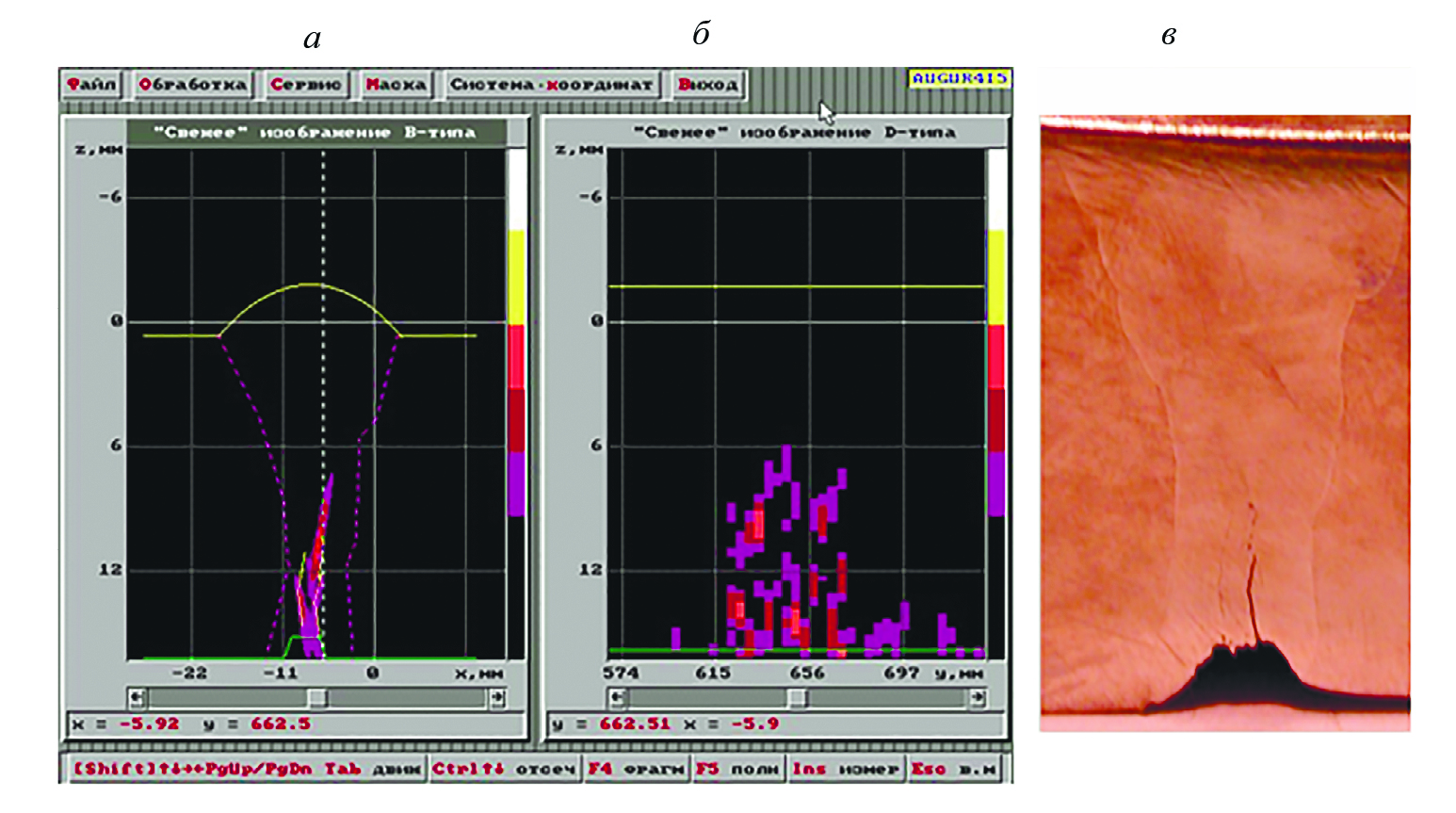 На таких томограммах изображение плоскостного дефекта (паза) можно соотнести с его фактической формой. Эффект усиливается, если одновременно фиксировать изображение дефекта в перпендикулярном сечении, как на рис. 19а, б. Однако по изображениям на рис. 15, 19, 21 раскрытие и координаты «острия» реального или «искусственного» дефекта можно только оценить в пределах 2-3 мм в зависимости от уровня чувствительности, на котором выполняется измерение. Это естественное ограничение связано с соотношением длины УЗ волны, длительности импульса и достижимой разрешающей способностью. Более того, изображение реальных трещин на томограммах по сравнению с изображениями искусственных дефектов (пазов) может дополнительно расширяться в связи с рассеянием УЗ волн на шероховатой поверхности дефекта, наклоненного по отношению к поверхностям изделия [5, 63].