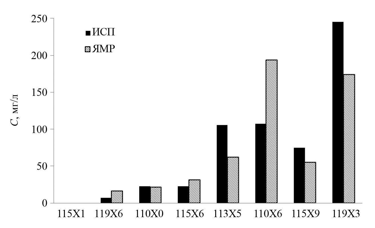 Анализ табл. 1 и рис. 2 показывает, что метод ЯМР-релаксометрии позволяет фиксировать малые концентрации лития на уровне 10—20 мг/л. Наблюдаемые расхождения результатов анализа методами ИСП и ЯМР могут быть обусловлены следующими причинами. При подготовке к анализу методом ИСП проводилось фильтрование исследуемой скважинной жидкости. В результате возможно удаление части лития вместе с отфильтрованной взвесью, что привело к занижению определяемой концентрации лития по сравнению с методом ЯМР, при котором фильтрация не проводится. Погрешность метода ЯМР может быть обусловлена добавлением CuSO4 в образцы пластовых вод. Содержащиеся в исследуемых образцах соли лития при реакции с CuSO4 могли образовать осадок, содержащий литий, который не фиксировался методом ЯМР. В результате ЯМР показал концентрацию лития меньше, чем ИСП. Для более точного сравнения методов необходим химический анализ пластовых вод для выяснения возможности образования содержащего литий осадка при реакции с CuSO4, тем не менее предлагаемый метод позволяет оперативно определять промышленно значимые концентрации лития.