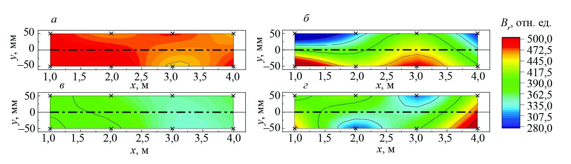 Рис. 2. Распределение остаточной магнитной индукции по трубе до гидроиспытания (а, в) и во время гидроиспытания (б, г), измеренной по оси (а, б) и по кольцу (в, г); × — точки, в которых проводились измерения.