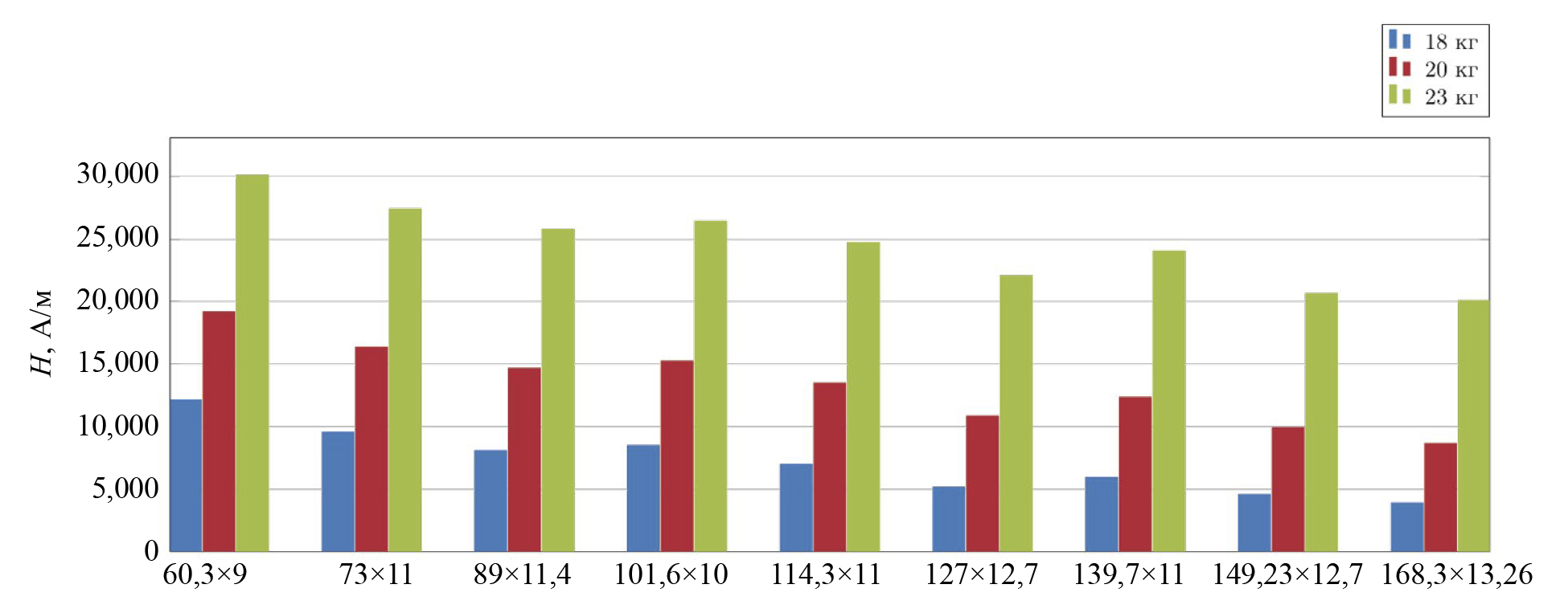 Рис. 1. Амплитуды напряженности магнитного поля в рабочей области при использовании трех катушек намагничивания с массами обмоток 18, 20 и 23 кг на всех существующих типоразмерах бурильных труб.