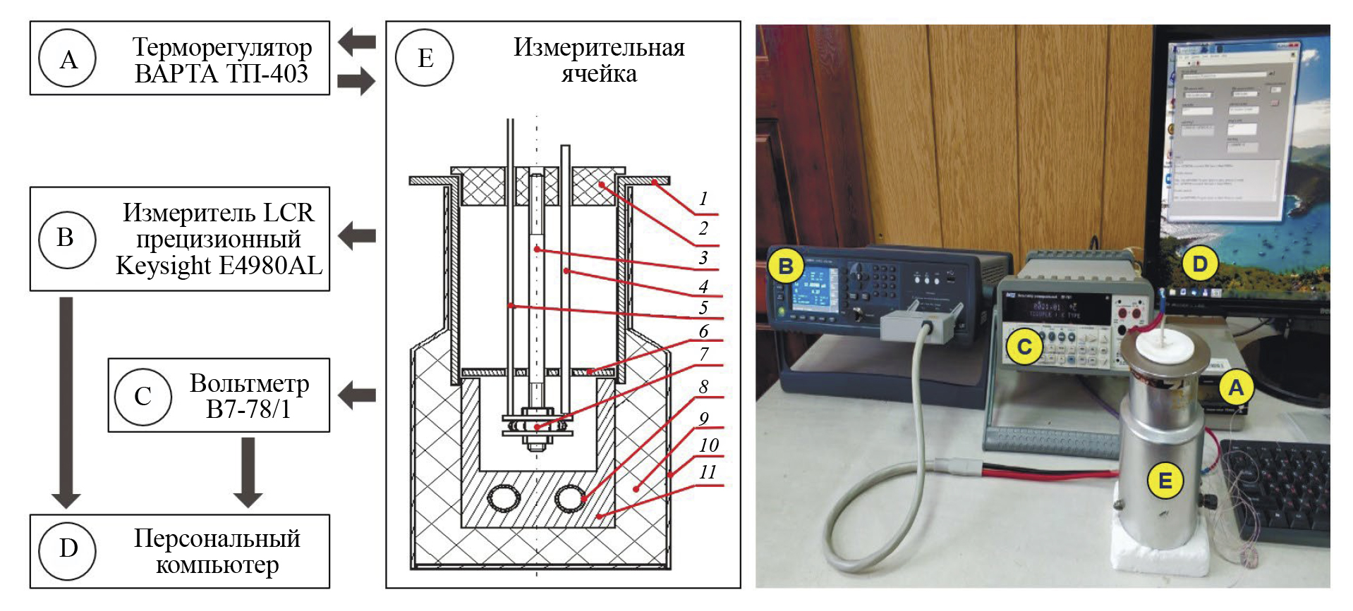 Универсальный вольтметр В7-78/1 выполнял роль измерителя температуры, получая информацию с термопары, находящейся в измерительной ячейке. Для автоматизированного сбора данных применялся персональный компьютер и специализированное программное обеспечение, разработанное с использованием среды программирования LABView.