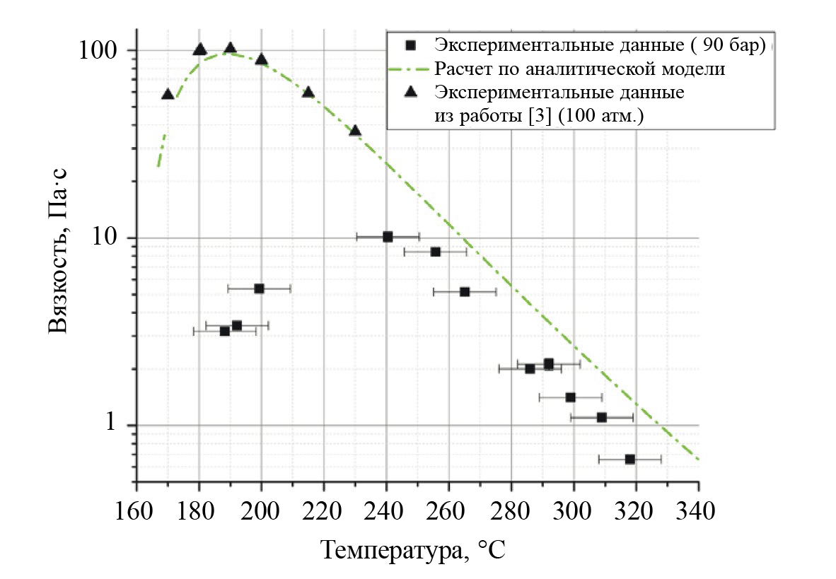 Поскольку при измерениях методом Стокса вязкость серы определяется через разность плотностей шарика (ρs = 15,77 г/см3) и расплава (ρl = 1,6 – 1,9 г/см3), то изменение плотности расплава серы вносит ошибку на уровне 1—1,5 %. На рис. 6 представлены полученные значения вязкости серы при давлении 90 бар в сравнении с экспериментальными данными из работы [3] при давлении 100 атм. и расчетом по аналитической модели, предложенной в работе [14].