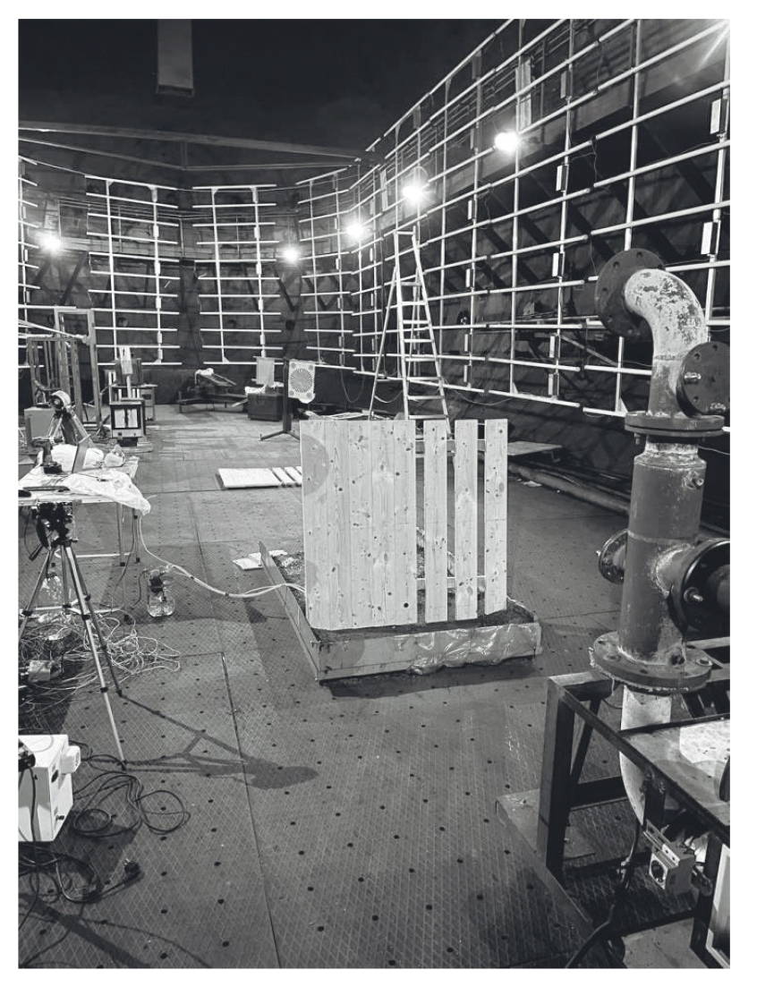 Экспериментальное оборудование включало: ИК-камеру JADE J530SB с узкополосным оптическим фильтром (рабочая длина волны 2,5—2,7 мкм), позволяющую регистрировать температуру в диапазоне 300—1500 °С, выбор которого обусловлен большой интенсивностью излучения паров воды и углекислого газа в используемом спектральном диапазоне, а также объектив с фокусным расстоянием 50 мм. В установку также входили видеокамеры Canon LEGRIA HF R86 («Canon Inc.», Китай) и Sony FDR X3000 («Sony Group Corporation», Китай) для оценки задержки зажигания рассматриваемых образцов древесных строительных материалов и фиксации процесса генерации и переноса частиц; термопары типа K с диаметром спая 200 мкм для оценки поля температуры вблизи поверхности деревянных образцов; датчик теплового потока Hukseflux SBG01 с рабочим диапазоном 0—100 кВт/м2; прибор АКИП-74824А для регистрации термоЭДС; анализатор влажности AND MX-50 для контроля влагосодержания исследуемых образцов. Формат ИК-термограммы — 320 × 240 пикселей. Частота регистрации термограмм составляла 7 Гц. Расстояние от выходной части генератора частиц до тепловизора было равно 3 м. Физическая область, анализируемая ИК-камерой, составляла 0,71 × 0,53 м.