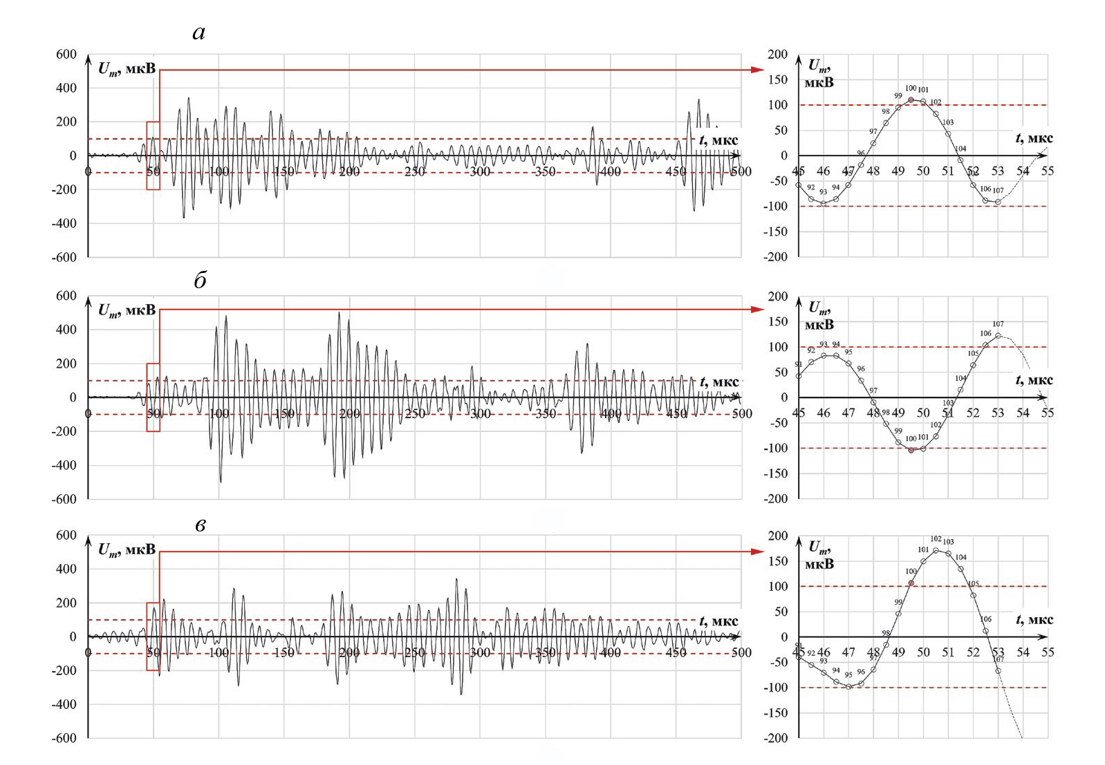 При увеличении расстояния между источником и приемными преобразователями передний фронт импульсов АЭ становится более пологим (рис. 3б и 3в) вследствие затухания высокочастотных мод. Как видно из рис. 3в, максимальная амплитуда фронта нарастающей волны не превышает напряжения порога дискриминации сигналов, что приводит к задержке его регистрации на Δt1 = 2,7 мкс.