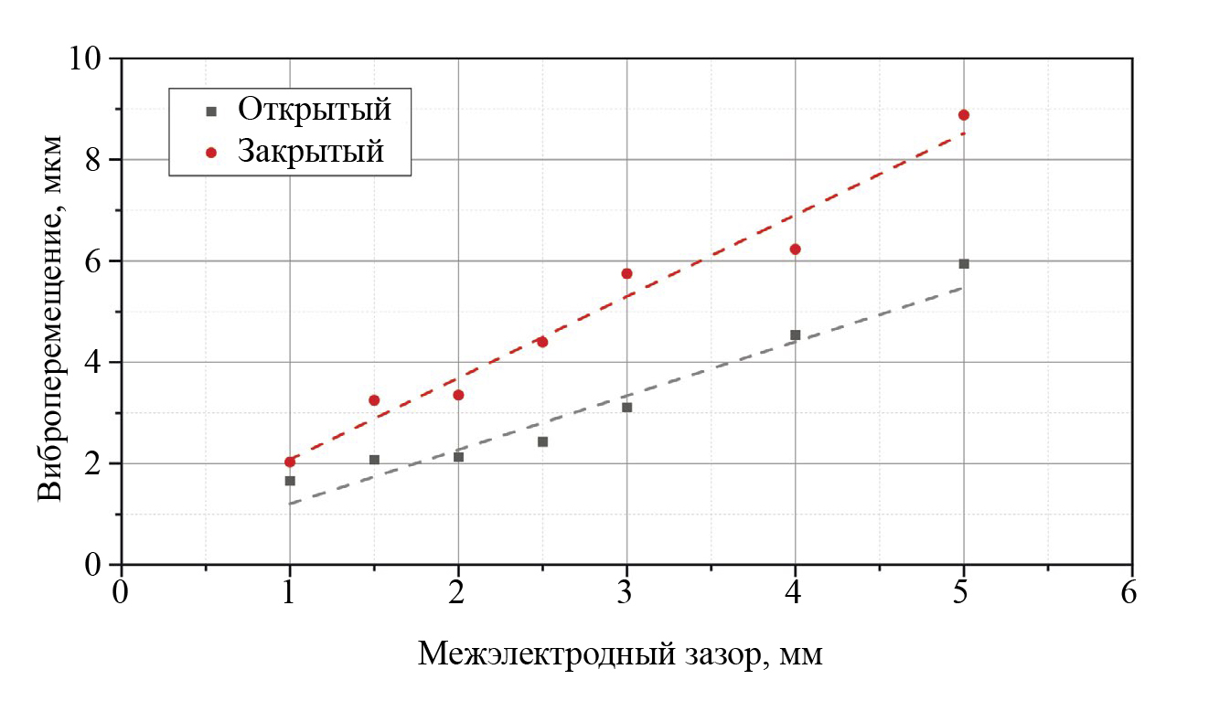 При межэлектродном зазоре 1 мм амплитуда виброперемещения на мембранах ГЭАП закрытого и открытого типов сопоставима и достигает около 2 мкм. Соответствующие значения амплитуды виброскорости мембран открытого и закрытого типа также сопоставимы, и составляют 50 и 45 мм/с соответственно. На графике (см. рис. 5) видно, что среднее значение виброперемещения мембраны ГЭАП закрытого типа в рассматриваемом временном интервале отлично от нуля. Наблюдается смещение равновесного положения мембраны амплитудой около 1 мкм с характерной длительностью процесса порядка 0,5 мс. Это можно объяснить действием избыточного давления в газоразрядной камере, которое возникает ввиду теплового расширения газа при протекании тока разряда. В ГЭАП с открытой системой электродов такой эффект практически не выражен.