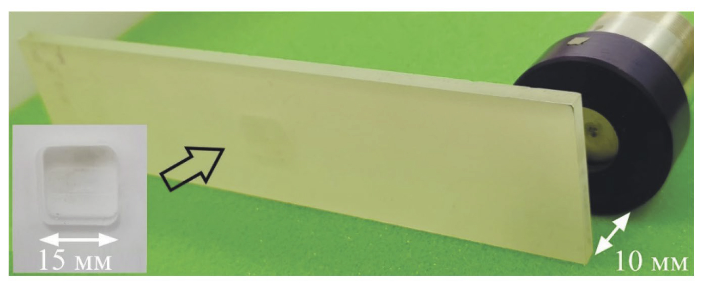 Для выявления особенностей, возникающих при использовании ГЭАП открытого и закрытого типов в задачах дефектоскопии, проведены тестовые эксперименты с модельным дефектом в полимерном материале. В качестве образца для экспериментов использовалась пластина из полиметилметакрилата (ПММА) размером 214×60×4 мм3 с модельным дефектом в виде несквозного прямоугольного отверстия размером 15,0×14,6 мм, расположенным в центре. Глубина отверстия составляла 3,5 мм. В ходе эксперимента ГЭАП размещали с оборотной стороны пластины на расстоянии 10 мм от ее поверхности, как показано на рис. 9.