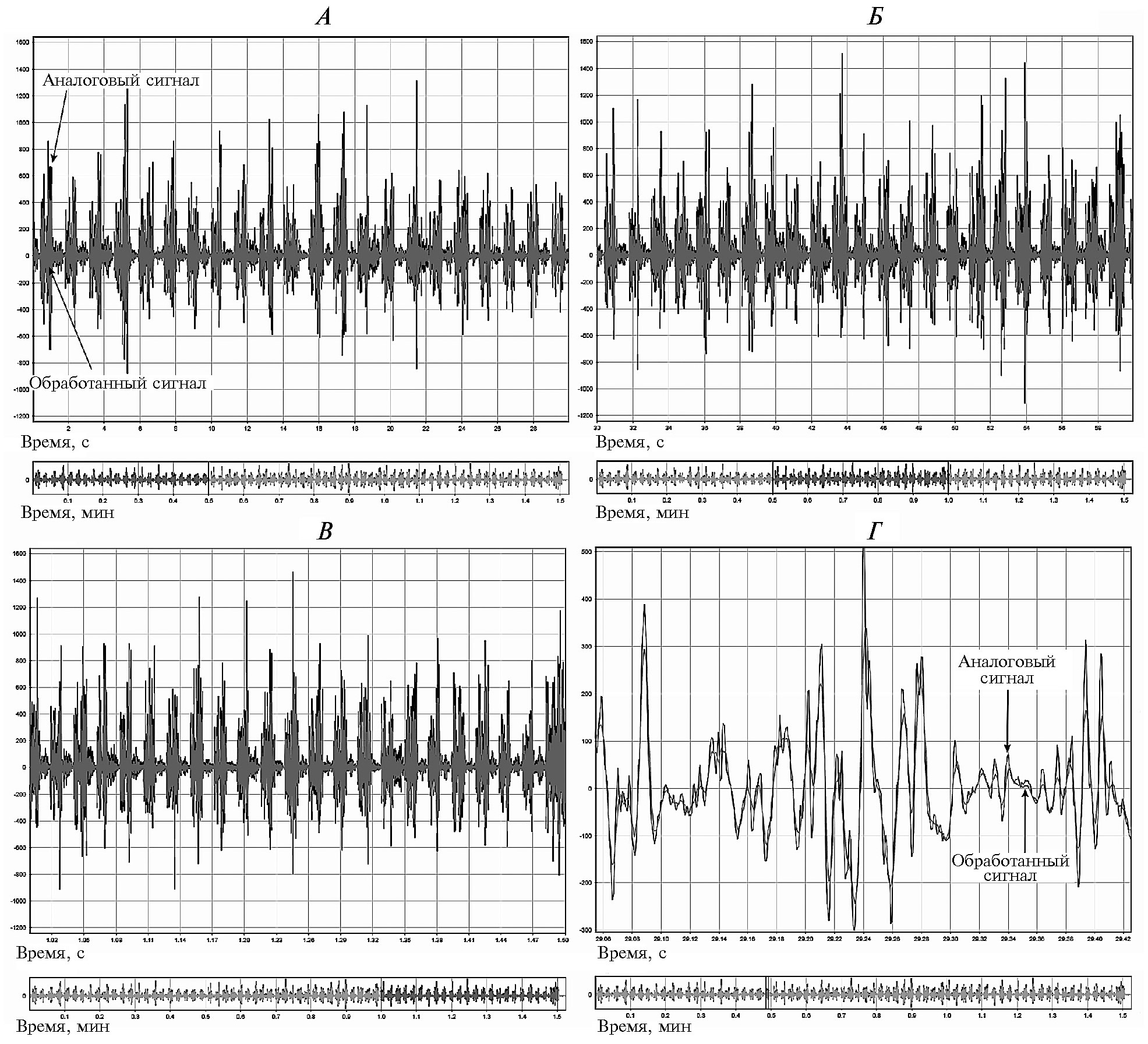 А — участок записи биопотенциалов мышц без чрескожной электрической стимуляции спинного мозга (ЧЭССМ); Б — участок записи биопотенциалов мышц во время ЧЭССМ; В — участок записи биопотенциалов после ЧЭССМ; Г — отметка ЧЭССМ.