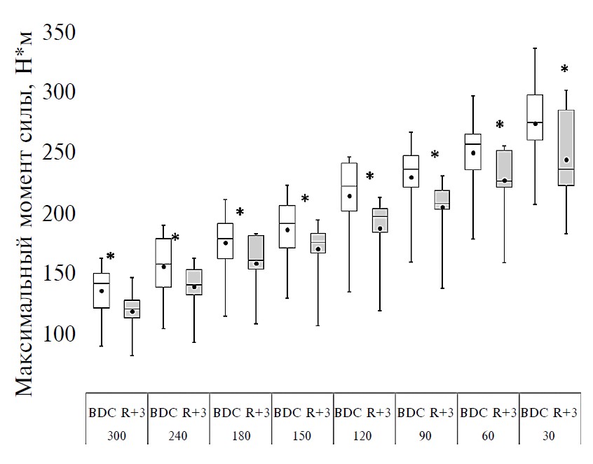 Анализ результатов выявил снижение максимального момента силы от 9 до 15% после гипокинезии по сравнению с исходным уровнем. Наибольшие “потери” показателей максимальной произвольной силы мышц передней поверхности бедра после АНОГ были обнаружены на угловой скорости 30 град/с (15% по сравнению с исходным уровнем, p < 0.05), при которой разгибание в коленном суставе обеспечивается в основном силовой составляющей и активацией как быстрых, так и медленных двигательных единиц. На угловых скоростях, отражающих “работу” быстрых двигательных единиц мышц-разгибателей коленного сустава (300, 240, 180, 150 град/с), снижение максимальной произвольной силы достигало 10%. Если сравнить всю совокупность изменений скоростно-силовых показателей, проанализированных нами на всем диапазоне угловых скоростей тестового протокола, то наибольшие “потери” после 21-суточной АНОГ были выявлены на низких угловых скоростях — от 120 до 30 град/с, где главенствующая роль принадлежит силовой составляющей для обеспечения разгибания в коленном суставе.