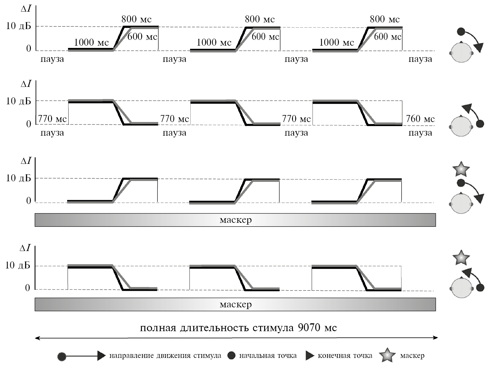 Пространственное положение всех стимулов задавалось величиной межушных различий по интенсивности (ΔIс сигнала и ΔIм маскера). В эксперименте использовали три типа маскеров с ΔIм = –10, 0 и +10 дБ. Эти стимулы вызывали ощущение неподвижного звукового образа, расположенного вблизи левого уха, около средней линии головы или у правого уха, и далее обозначены как левый, центральный и правый соответственно. Длительность маскера составляла 9070 мс (рис. 1). Фронты длительностью 10 мс, сглаженные косинусоидальной функцией, были наложены в начале и в конце маскера, а также в начале и в конце каждого из тестовых сигналов. Длительность стимулов здесь и далее приводится без учета фронтов.