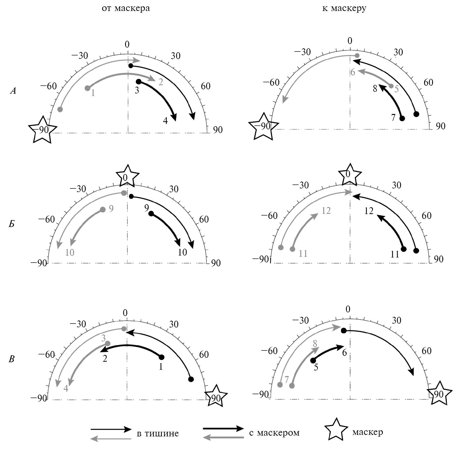 Рис. 2. Воспринимаемые траектории движения сигналов в тишине и при маскировке. А, В — в сериях с латеральными маскерами, Б — с центральным маскером. Полукружные дуги — схематическое изображение переднего сектора субъективного звукового пространства. Шкалы на дугах — угловое расстояние от средней линии головы (азимут), в градусах. Стрелки — воспринимаемые траектории движения сигналов. Линии одного цвета (серые или черные) соответствуют траекториям одного и того же сигнала в тишине (тонкие линии) и при маскировке (жирные линии). Цифры около стрелок — условная нумерация НТ и КТ.