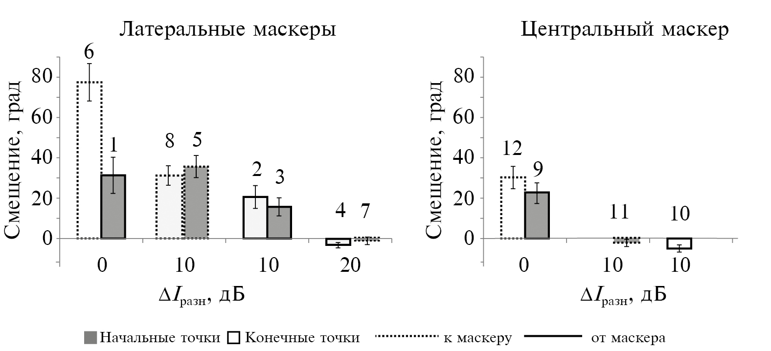 Анализ смещения центральных и латеральных точек под действием ближайших к ним маскеров (ΔIразн = 0 дБ) и при разнесении сигнала и маскера на расчетное угловое расстояние 90 град (ΔIразн = 10 дБ). Для того чтобы проверить, совпадает ли действие факторов Направление движения и Точка при действии центральных и латеральных маскеров, а также зависит ли оно от расстояния между сигналом и маскером, был проведен трехфакторный дисперсионный анализ rmANOVA с факторами Маскер (центральный, латеральный), Точка (начальная, конечная) и Расстояние до маскера (ΔIразн = 0 дБ, ΔIразн = 10 дБ). Важно, что здесь эффект Направления движения не присутствует в явном виде, но может проявляться через взаимодействие факторов Точка и Расстояние до маскера. Для ближних точек (ΔIразн = 0 дБ), если точка начальная (1 и 9), то сигнал двигался от маскера, а если точка конечная (6 и 12), то сигнал двигался к маскеру. Для дальних точек (ΔIразн = 10 дБ), наоборот, если точка начальная (5 и 11), то сигнал двигался к маскеру, если точка конечная (2 и 10), то сигнал двигался от маскера (рис. 4, Б и В).