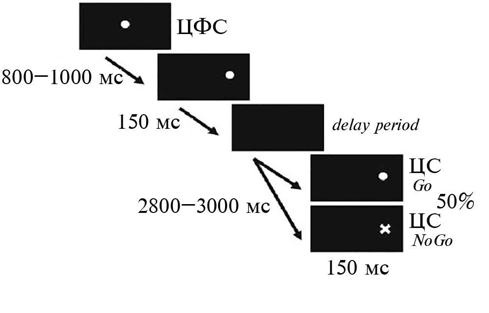 В исследовании применяли модифицированный вариант парадигмы "Go/NoGo" – "Go/NoGo delay" [16]. Использовали три типа зрительных стимулов – фиксационный в центре экрана (ЦФС), и два периферических стимула на расстоянии 7 угл. град слева или справа от ЦФС по горизонтали – сигнальный (СС) и целевой (ЦС). СС сигнализировал о локализации ЦС, который включался через 2.8–3 мс после выключения СС (межстимульный интервал или delay-период) и указывал на характер ответа. Временная последовательность событий в экспериментальной схеме представлена на рис. 1.