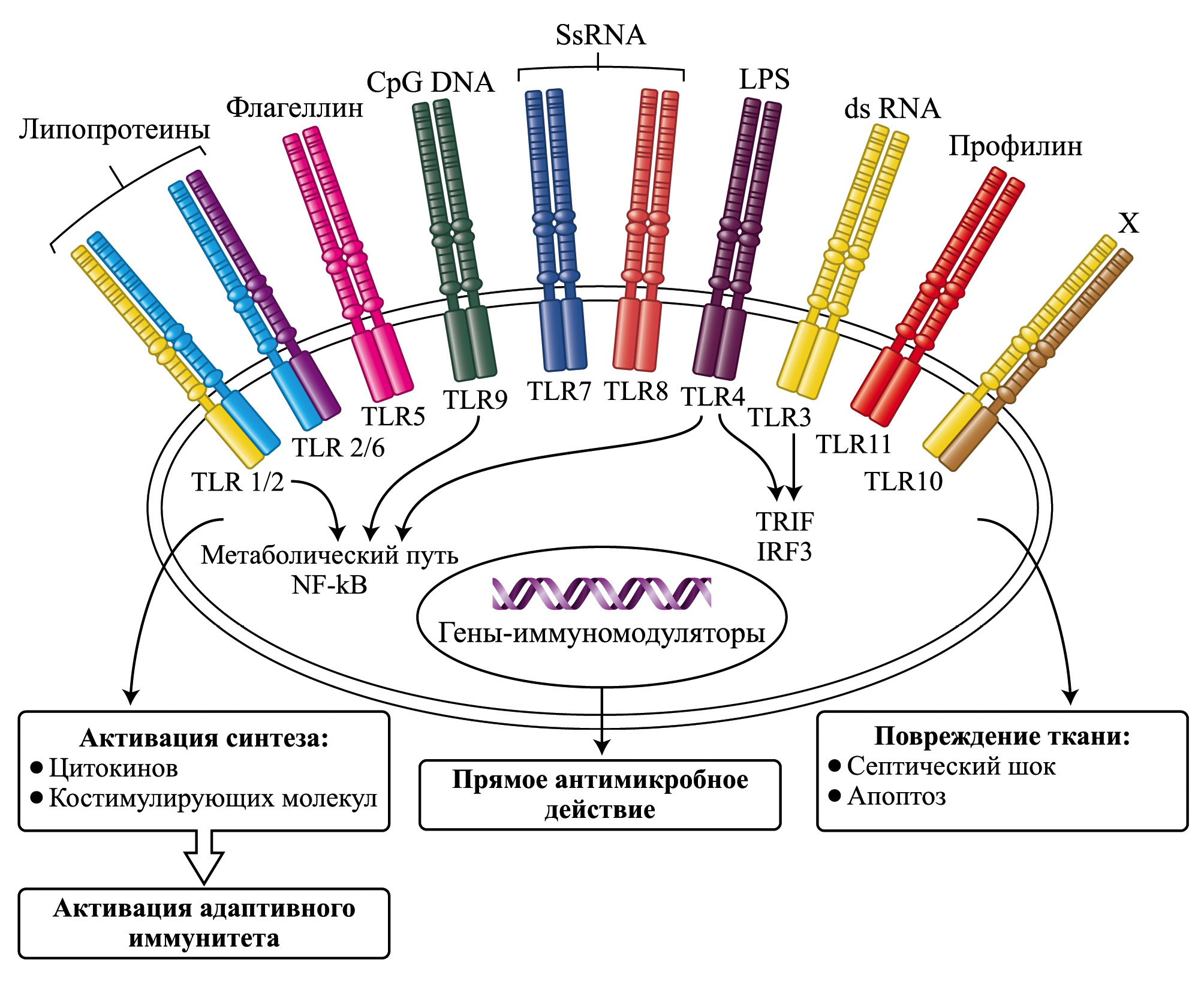 Высокий уровень ЛПС в крови больных "микробиота-ассоциированными заболеваниями" (МАЗ) трактуется исследователями всего лишь как маркёр повышенной кишечной проницаемости, что не совсем корректно, как с методической, так и методологической точек зрения, поскольку не только кишечник может быть источником избыточного поступления ЭТ в общий кровоток, но и жировая ткань (депо гидрофобной формы ЛПС), подвергающаяся липолизу при стрессе [17, 22]. Целесообразно напомнить определение ЭА, которое было сформулировано на страницах журнала "Физиология человека" [23] и уточнено спустя 20 лет [7]: "Эндотоксиновая агрессия кишечного и/или иного происхождения — патогенный процесс индукции системного воспаления, являющегося предболезнью и универсальным фактором общей патологии, который манифестируется той или иной нозологической формой заболевания в силу генетической и/или приобретенной предрасположенности". Это определение не исключает участие и иных структурных компонентов и метаболитов МК в патогенезе заболеваний, которые являются лигандами Toll-рецепторов врожденного иммунитета (рис. 1), а лишь подчеркивает центральную роль TLR4 в регуляции активности иммунной системы в силу своей уникальной способности влиять на ядро при помощи не одного, как все остальные TLR, а двух сигнальных путей. Кроме того, для взаимодействия ЛПС с TLR4 необходим целый ряд молекул и адаптерных белков, синтезируемых главным образом в печени, что обеспечивает вовлеченность этого органа в регуляцию уровня базисной активности иммунной системы, и позволяет квалифицировать ЭТ как "экзогормон". Принципиально важным для фундаментальной науки является выяснение возможной синергии и/или антагонизма между трансмембранными рецепторами семейства TLR, вполне вероятной конкуренцией за "средства доставки" лигандов к рецепторам и адаптерные белки, др.